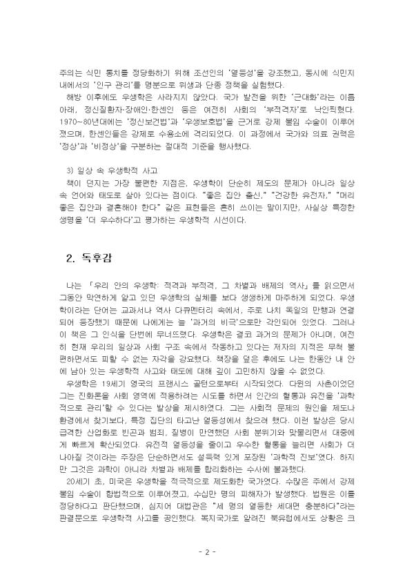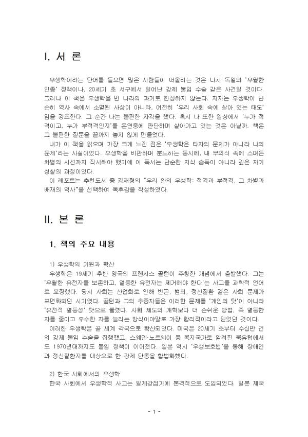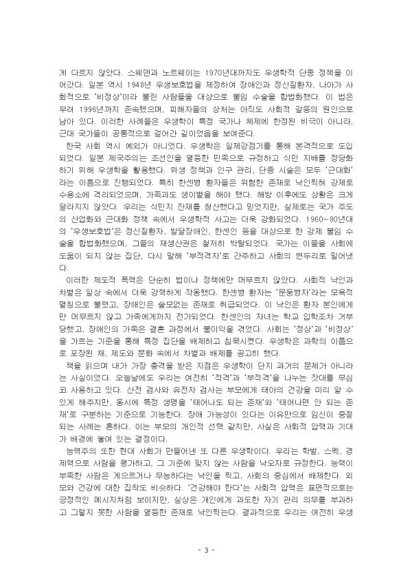¿ì»ýÇÐÀ̶ó´Â ´Ü¾î¸¦ µéÀ¸¸é ¸¹Àº »ç¶÷µéÀÌ ¶°¿Ã¸®´Â °ÍÀº ³ªÄ¡ µ¶ÀÏÀÇ ¡®¿ì¿ùÇÑ ÀÎÁ¾¡¯ Á¤Ã¥À̳ª, 20¼¼±â ÃÊ ¼±¸¿¡¼ ÀÏ¾î³ °Á¦ ºÒÀÓ ¼ö¼ú °°Àº »ç°ÇÀÏ °ÍÀÌ´Ù. ±×·¯³ª ÀÌ Ã¥Àº ¿ì»ýÇÐÀ» ¸Õ ³ª¶óÀÇ °ú°Å·Î ÇÑÁ¤ÇÏÁö ¾Ê´Â´Ù. ÀúÀÚ´Â ¿ì»ýÇÐÀÌ ´Ü¼øÈ÷ ¿ª»ç ¼Ó¿¡¼ ¼Ò¸êµÈ »ç»óÀÌ ¾Æ´Ï¶ó, ¿©ÀüÈ÷ ¡®¿ì¸® »çȸ ¼Ó¿¡ »ì¾Æ Àִ ŵµ¡¯ÀÓÀ» °Á¶ÇÑ´Ù. ±× ¼ø°£ ³ª´Â ºÒÆíÇÑ ÀÚ°¢À» Çß´Ù. Ȥ½Ã ³ª ¶ÇÇÑ Àϻ󿡼 ¡®´©°¡ Àû°ÝÀ̰í, ´©°¡ ºÎÀû°ÝÀÎÁö¡¯¸¦ Àº¿¬Áß¿¡ ÆÇ´ÜÇÏ¸ç »ì¾Æ°¡°í ÀÖ´Â °ÍÀº ¾Æ´Ò±î. Ã¥Àº ±× ºÒÆíÇÑ Áú¹®À» ³¡±îÁö ³õÁö ¾Ê°Ô ¸¸µé¾ú´Ù. ³»°¡ ÀÌ Ã¥À» ÀÐÀ¸¸ç °¡Àå Å©°Ô ´À³¤ Á¡Àº ¡®¿ì»ýÇÐÀº ŸÀÚÀÇ ¹®Á¦°¡ ¾Æ´Ï¶ó ³ªÀÇ ¹®Á¦¡¯¶ó´Â »ç½ÇÀ̾ú´Ù. ¿ì»ýÇÐÀ» ºñÆÇÇÏ¸ç ºÐ³ëÇÏ´Â µ¿½Ã¿¡, ³» ¹«ÀÇ½Ä ¼Ó¿¡ ½º¸çµç Â÷º°ÀÇ ½Ã¼±±îÁö Á÷½ÃÇØ¾ß Ç߱⿡ ÀÌ µ¶¼´Â ´Ü¼øÇÑ Áö½Ä ½ÀµæÀÌ ¾Æ´Ï¶ó ±íÀº Àڱ⠼ºÂûÀÇ °úÁ¤À̾ú´Ù. ÀÌ ·¹Æ÷Æ®´Â Ãßõµµ¼ Áß ±èÀçÇüÀÇ ¡°¿ì¸® ¾ÈÀÇ ¿ì»ýÇÐ: Àû°Ý°ú ºÎÀû°Ý, ±× Â÷º°°ú ¹èÀçÀÇ ¿ª»ç¡±À» ¼±ÅÃÇÏ¿© µ¶ÈݨÀ» ÀÛ¼ºÇÏ¿´´Ù. II. º» ·Ð 1. Ã¥ÀÇ ÁÖ¿ä ³»¿ë 1) ¿ì»ýÇÐÀÇ ±â¿ø°ú È®»ê ¿ì»ýÇÐÀº 19¼¼±â ÈÄ¹Ý ¿µ±¹ÀÇ ÇÁ·£½Ã½º °ñÅÏÀÌ ÁÖâÇÑ °³³ä¿¡¼ Ãâ¹ßÇß´Ù. ±×´Â ¡®¿ì¿ùÇÑ À¯ÀüÀÚ¸¦ º¸Á¸Çϰí, ¿µîÇÑ À¯ÀüÀÚ´Â Á¦°ÅÇØ¾ß ÇÑ´Ù¡¯´Â »ç°í¸¦ °úÇÐÀû ¾ð¾î·Î Æ÷ÀåÇß´Ù. ´ç½Ã »çȸ´Â »ê¾÷È·Î ÀÎÇØ ºó°ï, ¹üÁË, Á¤½ÅÁúȯ °°Àº »çȸ ¹®Á¦°¡ Ç¥¸éȵǴø ½Ã±â¿´´Ù. °ñÅϰú ±×ÀÇ ÃßÁ¾ÀÚµéÀº ÀÌ·¯ÇÑ ¹®Á¦¸¦ ¡®°³ÀÎÀÇ Å¿¡¯ÀÌ ¾Æ´Ï¶ó ¡®À¯ÀüÀû ¿µî¼º¡¯ Å¿À¸·Î µ¹·È´Ù. »çȸ Á¦µµÀÇ °³Çõº¸´Ù ´õ ¼Õ½¬¿î ¹æ¹ý, Áï ¿µîÇÑ ÀÚ¸¦ ÁÙÀÌ°í ¿ì¼öÇÑ ÀÚ¸¦ ´Ã¸®´Â ¹æ½ÄÀ̾߸»·Î °¡Àå ÇÕ¸®ÀûÀ̶ó°í ¹Ï¾ú´ø °ÍÀÌ´Ù. ÀÌ·¯ÇÑ ¿ì»ýÇÐÀº °ð ¼¼°è °¢±¹À¸·Î È®»êµÇ¾ú´Ù. ¹Ì±¹Àº 20¼¼±â ÃʺÎÅÍ ¼ö½Ê¸¸ °ÇÀÇ °Á¦ ºÒÀÓ ¼ö¼úÀ» ÁýÇàÇß°í, ½º¿þµ§¡¤³ë¸£¿þÀÌ µî º¹Áö±¹°¡·Î ¾Ë·ÁÁø ºÏÀ¯·´¿¡¼µµ 1970³â´ë±îÁöµµ ºÒÀÓ Á¤Ã¥ÀÌ À̾îÁ³´Ù. ÀϺ» ¿ª½Ã ¡®¿ì»ýº¸È£¹ý¡¯À» ÅëÇØ Àå¾ÖÀΰú Á¤½ÅÁúȯÀÚ¸¦ ´ë»óÀ¸·Î ÇÑ °Á¦ ´ÜÁ¾À» ÇÕ¹ýÈÇß´Ù. 2) Çѱ¹ »çȸ¿¡¼ÀÇ ¿ì»ýÇÐ Çѱ¹ »çȸ¿¡¼ ¿ì»ýÇÐÀû »ç°í´Â ÀÏÁ¦°Á¡±â¿¡ º»°ÝÀûÀ¸·Î µµÀԵǾú´Ù. ÀϺ» Á¦±¹ÁÖÀÇ´Â ½Ä¹Î ÅëÄ¡¸¦ Á¤´çÈÇϱâ À§ÇØ Á¶¼±ÀÎÀÇ ¡®¿µî¼º¡¯À» °Á¶Çß°í, µ¿½Ã¿¡ ½Ä¹ÎÁö ³»¿¡¼ÀÇ ¡®Àα¸ °ü¸®¡¯¸¦ ¸íºÐÀ¸·Î À§»ý°ú ´ÜÁ¾ Á¤Ã¥À» ½ÇÇèÇß´Ù. ÇØ¹æ ÀÌÈÄ¿¡µµ ¿ì»ýÇÐÀº »ç¶óÁöÁö ¾Ê¾Ò´Ù. ±¹°¡ ¹ßÀüÀ» À§ÇÑ ¡®±Ù´ëÈ¡¯¶ó´Â À̸§ ¾Æ·¡, Á¤½ÅÁúȯÀÚ¡¤Àå¾ÖÀΡ¤ÇѼ¾ÀÎ µîÀº ¿©ÀüÈ÷ »çȸÀÇ ¡®ºÎÀû°ÝÀÚ¡¯·Î ³«ÀÎÂïÇû´Ù. 1970~80³â´ë¿¡´Â ¡®Á¤½Åº¸°Ç¹ý¡¯°ú ¡®¿ì»ýº¸È£¹ý¡¯À» ±Ù°Å·Î °Á¦ ºÒÀÓ ¼ö¼úÀÌ ÀÌ·ç¾îÁ³À¸¸ç, ÇѼ¾ÀεéÀº °Á¦·Î ¼ö¿ë¼Ò¿¡ °Ý¸®µÇ¾ú´Ù. ÀÌ °úÁ¤¿¡¼ ±¹°¡¿Í ÀÇ·á ±Ç·ÂÀº ¡®Á¤»ó¡¯°ú ¡®ºñÁ¤»ó¡¯À» ±¸ºÐÇÏ´Â Àý´ëÀû ±âÁØÀ» Çà»çÇß´Ù. 3) ÀÏ»ó ¼Ó ¿ì»ýÇÐÀû »ç°í Ã¥ÀÌ ´øÁö´Â °¡Àå ºÒÆíÇÑ ÁöÁ¡Àº, ¿ì»ýÇÐÀÌ ´Ü¼øÈ÷ Á¦µµÀÇ ¹®Á¦°¡ ¾Æ´Ï¶ó ÀÏ»ó ¼Ó ¾ð¾î¿Í ŵµ·Î »ì¾Æ ÀÖ´Ù´Â Á¡ÀÌ´Ù. ¡°ÁÁÀº Áý¾È Ãâ½Å,¡± ¡°°Ç°ÇÑ À¯ÀüÀÚ,¡± ¡°¸Ó¸® ÁÁÀº Áý¾È°ú °áÈ¥ÇØ¾ß ÇÑ´Ù¡± °°Àº Ç¥ÇöµéÀº ÈçÈ÷ ¾²ÀÌ´Â ¸»ÀÌÁö¸¸, »ç½Ç»ó ƯÁ¤ÇÑ »ý¸íÀ» ¡®´õ ¿ì¼öÇÏ´Ù¡¯°í Æò°¡ÇÏ´Â ¿ì»ýÇÐÀû ½Ã¼±ÀÌ´Ù. 2. µ¶Èݨ ³ª´Â ¡¸¿ì¸® ¾ÈÀÇ ¿ì»ýÇÐ: Àû°Ý°ú ºÎÀû°Ý, ±× Â÷º°°ú ¹èÁ¦ÀÇ ¿ª»ç¡¹¸¦ ÀÐÀ¸¸é¼ ±×µ¿¾È ¸·¿¬ÇÏ°Ô ¾Ë°í ÀÖ´ø ¿ì»ýÇÐÀÇ ½Çü¸¦ º¸´Ù »ý»ýÇÏ°Ô ¸¶ÁÖÇÏ°Ô µÇ¾ú´Ù. ¿ì»ýÇÐÀ̶ó´Â ´Ü¾î´Â ±³°ú¼³ª ¿ª»ç ´ÙÅ¥¸àÅ͸® ¼Ó¿¡¼, ÁÖ·Î ³ªÄ¡ µ¶ÀÏÀÇ ¸¸Çà°ú ¿¬°áµÇ¾î µîÀåÇ߱⠶§¹®¿¡ ³ª¿¡°Ô´Â ´Ã ¡®°ú°ÅÀÇ ºñ±Ø¡¯À¸·Î¸¸ °¢ÀεǾî ÀÖ¾ú´Ù. ±×·¯³ª ÀÌ Ã¥Àº ±× ÀνÄÀ» ´Ü¹ø¿¡ ¹«³Ê¶ß·È´Ù. ¿ì»ýÇÐÀº °áÄÚ °ú°ÅÀÇ ¹®Á¦°¡ ¾Æ´Ï¸ç, ¿©ÀüÈ÷ ÇöÀç ¿ì¸®ÀÇ ÀÏ»ó°ú »çȸ ±¸Á¶ ¼Ó¿¡¼ ÀÛµ¿Çϰí ÀÖ´Ù´Â ÀúÀÚÀÇ ÁöÀûÀº ¹«Ã´ ºÒÆíÇϸ鼵µ ÇÇÇÒ ¼ö ¾ø´Â ÀÚ°¢À» °¿äÇß´Ù. Ã¥ÀåÀ» µ¤Àº ÈÄ¿¡µµ ³ª´Â Çѵ¿¾È ³» ¾È¿¡ ³²¾Æ ÀÖ´Â ¿ì»ýÇÐÀû »ç°í¿Í ŵµ¿¡ ´ëÇØ ±íÀÌ °í¹ÎÇÏÁö ¾ÊÀ» ¼ö ¾ø¾ú´Ù. ¿ì»ýÇÐÀº 19¼¼±â ¿µ±¹ÀÇ ÇÁ·£½Ã½º °ñÅÏÀ¸·ÎºÎÅÍ ½ÃÀ۵Ǿú´Ù. ´ÙÀ©ÀÇ »çÃÌÀ̾ú´ø ±×´Â ÁøÈ·ÐÀ» »çȸ ¿µ¿ª¿¡ Àû¿ëÇÏ·Á´Â ½Ãµµ¸¦ ÇÏ¸é¼ Àΰ£ÀÇ Ç÷Åë°ú À¯ÀüÀ» ¡®°ú