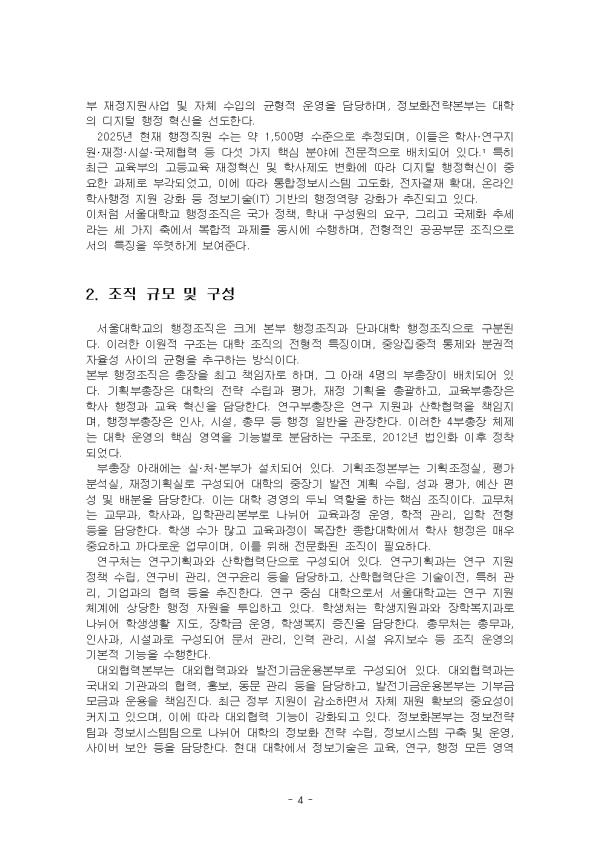 1. ¼±Á¤ ÀÌÀ¯ ù°, ¼¿ï´ëÇб³´Â 2011³â '±¹¸³´ëÇйýÀÎ ¼¿ï´ëÇб³ ¼³¸³¡¤¿î¿µ¿¡ °üÇÑ ¹ý·ü'¿¡ µû¶ó ±¹¸³´ëÇйýÀÎÀ¸·Î ÀüȯµÇ¾î 65³â°£ À¯ÁöÇØ¿Â ±¹¸³´ëÇб³ üÁ¦¿¡¼ µ¶¸³¹ýÀΠüÁ¦·Î º¯ÈÇÏ¿´´Ù. ÀÌ·¯ÇÑ ¹ýÀÎÈ´Â ´ëÇÐÀÇ ÀÚÀ²¼º°ú Ã¥ÀÓ¼ºÀ» ³ôÀ̱â À§ÇÑ Á¦µµÀû º¯È·Î¼, Á¶Á÷±¸Á¶¿¡ »ó´çÇÑ ¿µÇâÀ» ¹ÌÃÆÀ» °ÍÀ¸·Î ¿¹»óµÈ´Ù. µÑ°, ¼¿ï´ëÇб³´Â 16°³ ´Ü°ú´ëÇÐ, 1°³ ÇкδëÇÐ, ´Ù¼öÀÇ Àü¹®´ëÇпø°ú ´Ù¾çÇÑ ÇàÁ¤±â±¸¸¦ ¿î¿µÇÏ´Â ´ë±Ô¸ð Á¶Á÷À¸·Î¼ º¹ÀâÇÑ ÇàÁ¤Á¶Á÷ ±¸Á¶¸¦ °®Ãß°í ÀÖ¾î Á¶Á÷±¸Á¶ ºÐ¼®ÀÇ ÀÇ¹Ì ÀÖ´Â »ç·Ê°¡ µÉ ¼ö ÀÖ´Ù. - Áß·« - II. ¼¿ï´ëÇб³ ¼Ò°³ ¹× ÇöȲ 1. ¼¿ï´ëÇб³ÀÇ °³¿ä ¼¿ï´ëÇб³ÀÇ ÇàÁ¤Á÷ Á¶Á÷Àº ±¹³» ´ëÇÐ Áß °¡Àå Å« ±Ô¸ð¿Í º¹ÀâÇÑ ±¸Á¶¸¦ ÀÚ¶ûÇÑ´Ù. º»ºÎ, 16°³ ´Ü°ú´ëÇÐ, 10°³ Àü¹®´ëÇпø, 80¿© °³ ¿¬±¸¼Ò ¹× ´Ù¼öÀÇ ºÎ¼Ó±â°üÀ¸·Î ±¸¼ºµÇ¾î ÀÖÀ¸¸ç, °¢ ´ÜÀ§´Â µ¶¸³ÀûÀ̸鼵µ À¯±âÀûÀ¸·Î ¿¬°áµÇ¾î ¿î¿µµÈ´Ù. ÃѰý °ü¸® ±â´ÉÀº ÃÑÀå-ºÎÃÑÀå-º»ºÎ °¢ ½Ç¡¤Ã³°¡ Áß½ÉÀÌ µÇ¸ç, À̵éÀº ´ëÇÐ Àüü Àü·«°ú Á¤Ã¥À» ¼ö¸³ÇÏ°í ¿¹»ê ¹× Àλ縦 Æ÷ÇÔÇÑ ÇÙ½É ÇàÁ¤ ±â´ÉÀ» ´ã´çÇÑ´Ù. - Áß·« - |
