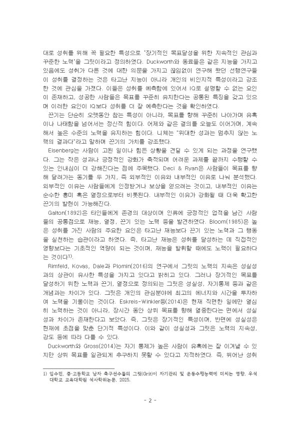 ¾î¶°ÇÑ È°µ¿À» ¼öÇàÇϱâ·Î ¸¶À½¸Ô°í ¸ñÇ¥¸¦ ¿Ï¼öÇØ ³»±â±îÁö ÀÏ·ÃÀÇ °úÁ¤ÀÌ ¼øÅºÄ¡¸¸Àº ¾Ê´Ù. ½ÃÀÛÇÒ ¶§´Â ´Ü´ÜÇÑ °¢¿À¸¦ °¡Áö°í ¸ñÇ¥¸¦ ¼³Á¤ÇÏ´õ¶óµµ ¸ðµÎ°¡ ÀÌ·ç¾î³¾ ¼ö ÀÖ´Â °ÍÀº ¾Æ´Ï´Ù. ±×¸´(Grit, ²ö±â)Àº ¿ª°æ¿¡ Á÷¸éÇØµµ Èçµé¸®Áö ¾Ê°í Èûµç µµÀüÀ» ¹Þ¾ÆµéÀÏ ¼ö ÀÖ´Â ¿ë±â¿¡¼ ½ÃÀ۵ȴÙ. ±×¸´Àº ¸ñÇ¥¿¡ °è¼Ó ÁýÁßÇÒ ¼ö ÀÖ´Â ²öÁú±ä ´É·ÂÀÌ´Ù. ¼º°øÀº ¿ì¸®°¡ ÀßÇÏ´Â ÀÏÀ» ÇÏ´Â µ¥¼¸¸ ¿À´Â °ÍÀÌ ¾Æ´Ï¶ó°í ¼³¸íÇÑ´Ù. ³«´ãÇÏÁö ¾Ê°í, Æ÷±âÇÏÁö ¾Ê°í, °è¼ÓÇØ¼ ³ë·ÂÇÏ´Â µ¥¼ ¿Â´Ù. ±×¸´À» »ç¿ëÇϸé óÀ½¿¡´Â ¾î·Á¿ü´ø ÀÏÀ» ÀßÇÒ ¼ö ÀÖ´Ù. ¿äÄÁ´ë, ¾î¶² ºÐ¾ß¿¡¼µç, ¼º°øÇÑ »ç¶÷µéÀº µÎ °¡Áö ¹æ½ÄÀ¸·Î ÀÛ¿ëÇÏ´Â ÀÏÁ¾ÀÇ °á´Ü·ÂÀ» °¡Áö°í ÀÖ¾ú´Ù. ù°, ÀÌ ¸ð¹üµéÀº À¯³È÷ ȸº¹·ÂÀÌ °ÇÏ°í ±Ù¸éÇß´Ù. µÑ°, ±×µéÀº ÀڽŵéÀÌ ¿øÇÏ´Â °ÍÀÌ ¹«¾ùÀÎÁö ¸Å¿ì ±íÀÌ ¾Ë°í ÀÖ¾ú´Ù. ±×µé¿¡°Ô´Â °á´Ü·Â°ú ¹æÇâÀÌ ÀÖ¾ú´Ù. ÀÌ ·¹Æ÷Æ®´Â Grit(²ö±â)ÀÇ °³³ä¿¡ ´ëÇØ ÇмúÀûÀ¸·Î Á¤¸®ÇÑ ÈÄ, Grit(²ö±â)¸¦ ÀÚ½ÅÀÇ »î¿¡¼ ¹ßÈÖÇß´ø °æÇèÀ» Á¦½ÃÇϰí, ÀÌ·¯ÇÑ °úÁ¤¿¡¼ ¹è¿îÁ¡°ú ´À³¤Á¡À» ±â¼úÇÏ¿´´Ù. II. º» ·Ð 1. Grit(²ö±â)ÀÇ °³³ä ±×¸´(Grit)¿¡ ´ëÇÑ °³³äÀº ´Ù¾çÇÏ°Ô Á¤ÀÇÇϰí ÀÖÁö¸¸, Áß¿äÇÑ °³³äÀû ¿ä¼Ò´Â Àç´É, ¿Á¤, ²ö±â, ³ë·ÂÀ̶ó ÇÒ ¼ö ÀÖ´Ù. »ç¶÷ÀÌ ¿øÇÏ´Â ¼º°ú¸¦ ÀÌ·ç±â À§ÇØ ÇÊ¿äÇÑ ¿ä¼Ò´Â ´Ù¾çÇÏÁö¸¸, ±× Áß¿¡¼ ±×¸´(Grit)À̶ó´Â °³ÀÎÀÇ Åµµ¿Í ³ë·ÂÀº Áß¿äÇÑ ¿ªÇÒÀ» ÇÑ´Ù. ÁöÀû ´É·ÂÀ̳ª ÇнÀ ÀáÀç·Â¸¸À¸·Î´Â ¼³¸íµÇÁö ¾Ê´Â ÀÌ Æ¯¼ºÀº ¸ñÇ¥¸¦ ÇâÇÑ Áö¼ÓÀûÀÎ ¿Á¤°ú Çå½ÅÀ» ÀǹÌÇÑ´Ù. ±×¸´Àº ¿øÇÏ´Â °ÍÀ» ÀÌ·ç±â À§ÇØ ¿À·£ ½Ã°£ µ¿¾È ¸ØÃßÁö ¾Ê°í ³ë·ÂÇÏ¸ç ¿Á¤À» À¯ÁöÇÏ´Â ´É·ÂÀ» ¶æÇÑ´Ù. Seligman(1998)Àº °³ÀÎÀÇ ±àÁ¤ÀûÀÎ ½É¸®¿¡ °ü½ÉÀ» µÎ°í °Á¡ °³¹ß ¹× Çູ ÁõÁøÀ» À§ÇÏ¿© °³ÀÎÀÇ ÁÖ°üÀûÀÎ °æÇè, ±àÁ¤ÀûÀÎ °³ÀÎÀÇ Æ¯¼º, Á¦µµÀû ÀåÄ¡¸¦ °Á¶ÇÏ¿´À¸¸ç ±àÁ¤ Á¤¼¿Í °¨Á¤À» ȯ±âÇÏ´Â °ÍÀº ¿ì¿ï°ú ºÒ¾È µîÀÇ ½É¸®Àû ºÎÀûÀÀ ¹®Á¦¸¦ È¿°úÀûÀ¸·Î ¿¹¹æÇϰí Ä¡·áÇÒ ¼ö ÀÖ´Ù°í ÁÖÀåÇÏ¿´´Ù. Duckworth´Â SeligmanÀÇ Áöµµ¸¦ ¹ÞÀ¸¸ç, Àΰ£ÀÇ ÀÇÁö¿Í ÀÚ±â ÀýÁ¦·Â ±×¸®°í Àç´Éº¸´Ù ¸ñÇ¥ ´Þ¼ºÀ» ¿¹ÃøÇÒ ¼ö ÀÖ´Â ¿ª·®ÀÎ ±×¸´À» ÁÖÁ¦·Î ¿¬±¸¸¦ ÁøÇàÇÏ¿´´Ù(Duckworth, 2019) Duckworth ¿Ü(2007)´Â ¿À·¡ ÀüºÎÅÍ ÀÌ·ç¾îÁø ¿¬±¸ ÀڷḦ ºÐ¼®ÇÏ¿´°í, À̸¦ Åä´ë·Î ¼ºÃ븦 À§ÇØ ²À ÇÊ¿äÇÑ Æ¯¼ºÀ¸·Î ¡®Àå±âÀûÀÎ ¸ñÇ¥´Þ¼ºÀ» À§ÇÑ Áö¼ÓÀûÀÎ °ü½É°ú ²ÙÁØÇÑ ³ë·Â¡¯À» ±×¸´À̶ó°í Á¤ÀÇÇÏ¿´´Ù. Duckworth¿Í µ¿·áµéÀº °°Àº Áö´ÉÀ» °¡Áö°í ÀÖÀ½¿¡µµ ¼ºÃë°¡ ´Ù¸¥ °Í¿¡ ´ëÇÑ Àǹ®À» °¡Áö°í ²÷ÀÓ¾øÀÌ ¿¬±¸ÇØ ¿Ô´ø ¼±Ç࿬±¸µéÀÌ ¼ºÃ븦 °áÁ¤ÇÏ´Â °ÍÀº Ÿ°í³ Áö´ÉÀÌ ¾Æ´Ï¶ó °³ÀÎÀÇ ºñÀÎÁöÀû Ư¼ºÀ̶ó°í °Á¶ÇÑ °Í¿¡ °ü½ÉÀ» °¡Á³´Ù. À̵éÀº ¼ºÃ븦 ¿¹ÃøÇÔ¿¡ ÀÖ¾î¼ IQ·Î ¼³¸íÇÒ ¼ö ¾ø´Â ¿äÀÎÀÌ Á¸ÀçÇϰí, ¼º°øÇÑ »ç¶÷µéÀº ¸ñÇ¥¸¦ ²ÙÁØÈ÷ À¯ÁöÇÑ´Ù´Â °øÅëµÈ Ư¡À» °®°í ÀÖÀ¸¸ç ÀÌ·¯ÇÑ ¿äÀÎÀÌ IQº¸´Ù ¼ºÃ븦 ´õ Àß ¿¹ÃøÇÑ´Ù´Â °ÍÀ» È®ÀÎÇÏ¿´´Ù. ²ö±â´Â ´Ü¼øÈ÷ ¿À·§µ¿¾È Âü´Â Ư¼ºÀÌ ¾Æ´Ï¶ó, ¸ñÇ¥¸¦ ÇâÇØ ²ÙÁØÈ÷ ³ª¾Æ°¡¸ç À¯È¤À̳ª ³ªÅÂÇÔÀ» ³Ñ¾î¼´Â Á¤½ÅÀû ÈûÀÌ´Ù. ¾îÁ¦¿Í °°Àº °áÀǸ¦ ¿À´Ãµµ À̾¸ç, °è¼ÓÇØ¼ ³ôÀº ¼öÁØÀÇ ³ë·ÂÀ» À¯ÁöÇÏ´Â ÈûÀÌ´Ù. ´Ïü´Â "À§´ëÇÑ ¼º°ú´Â ¸ØÃßÁö ¾Ê´Â ³ë·ÂÀÇ °á°ú´Ù"¶ó°í ¸»ÇÏ¸ç ²ö±âÀÇ °¡Ä¡¸¦ °Á¶Çß´Ù. Eisenberg´Â »ç¶÷ÀÌ °íµÈ ÀÏÀ̳ª Èûµç »óȲÀ» °ßµô ¼ö ÀÖ°Ô µÇ´Â °úÁ¤À» ¿¬±¸Çß´Ù. ±×´Â ÀÛÀº ¼º°ú³ª ±àÁ¤ÀûÀÎ °È°¡ ÃàÀûµÇ¸ç ¾î·Á¿î °úÁ¦¸¦ ³¡±îÁö ¼öÇàÇÒ ¼ö ÀÖ´Â Àγ»½ÉÀÌ ´õ °ÇØÁø´Ù´Â Á¡¿¡ ÁÖ¸ñÇß´Ù. Deci & RyanÀº »ç¶÷µéÀÌ ¸ñÇ¥¸¦ ÇâÇØ ´Þ·Á°¡´Â µ¿±â¸¦ µÎ °¡Áö, Áï ¿ÜºÎÀûÀÎ ÀÌÀ¯¿Í ³»ºÎÀûÀÎ ÀÌÀ¯·Î ³ª´² ºÐ¼®Çß´Ù. ¿ÜºÎÀûÀÎ ÀÌÀ¯´Â »ç¶÷µé¿¡°Ô ÀÎÁ¤¹Þ°Å³ª º¸»óÀ» ¾òÀ¸·Á´Â °ÍÀ̰í, ³»ºÎÀûÀÎ ÀÌÀ¯´Â ¼ø¼öÇÑ Èï¹Ì ȤÀº ¿Á¤À¸·ÎºÎÅÍ ºñ·ÔµÈ´Ù. ³»ºÎÀûÀÎ ÀÌÀ¯°¡ °ÈµÉ ¶§ ´õ¿í È®°íÇÑ ²ö±âÀÇ ¹ßÇöÀÌ °¡´ÉÇØÁø´Ù. Galton(1892)Àº ŸÀε鿡°Ô Á¸°æÀÇ ´ë»óÀ̸ç Àηù¿¡ ±àÁ¤ÀûÀÎ ¾÷ÀûÀ» ³²±ä »ç¶÷µéÀÇ °øÅëÁ¡À¸·Î Àç´É, ¿Á¤, ²ö±â ÀÖ´Â ³ë·Â µîÀ» ¹ß°ßÇÏ¿´´Ù. Bloom(1985)Àº ³ôÀº ¼ºÃ븦 °¡Áø »ç¶÷ÀÇ ÁÖ¿äÇÑ ¿äÀÎÀº Ÿ°í³ Àç´Éº¸´Ù ²ö±â ÀÖ´Â ³ë·Â°ú ±× ÇൿÀ» ½ÇõÇÏ´Â ½À°üÀ̶ó°í ÇÏ¿