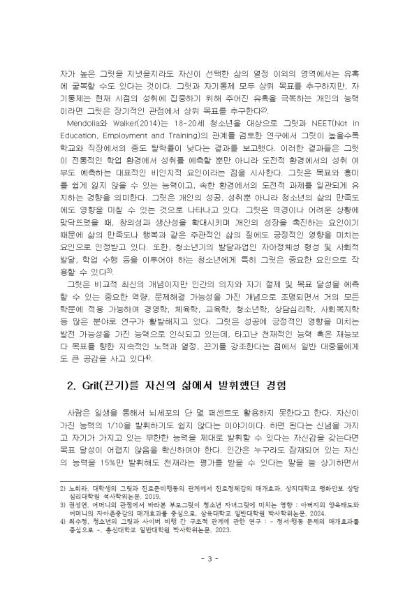 | 2025³â 2Çб⠽ɸ®Çп¡°Ô¹¯´Ù Ãâ¼®¼ö¾÷´ëü½ÃÇè °úÁ¦¹°(Grit(²ö±â)ÀÇ °³³ä, °æÇè) |