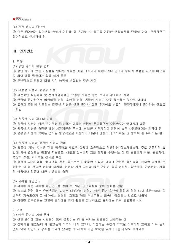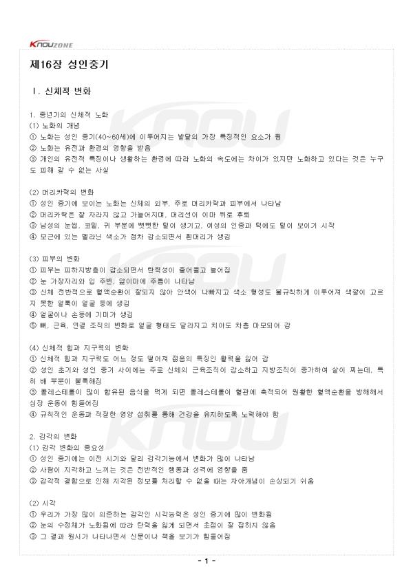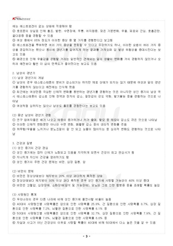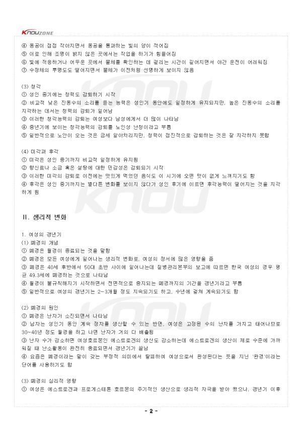 ¥°. ½ÅüÀû º¯È 1. Áß³â±âÀÇ ½ÅüÀû ³ëÈ (1) ³ëÈÀÇ °³³ä ¨ç ³ëÈ´Â ¼ºÀÎ Áß±â(40~60¼¼)¿¡ ÀÌ·ç¾îÁö´Â ¹ß´ÞÀÇ °¡Àå Æ¯Â¡ÀûÀÎ ¿ä¼Ò°¡ µÊ ¨è ³ëÈ´Â À¯Àü°ú ȯ°æÀÇ ¿µÇâÀ» ¹ÞÀ½ ¨é °³ÀÎÀÇ À¯ÀüÀû Ư¡À̳ª »ýȰÇϴ ȯ°æ¿¡ µû¶ó ³ëÈÀÇ ¼Óµµ¿¡´Â Â÷À̰¡ ÀÖÁö¸¸ ³ëÈÇϰí ÀÖ´Ù´Â °ÍÀº ´©±¸µµ ÇÇÇØ °¥ ¼ö ¾ø´Â »ç½Ç (2) ¸Ó¸®Ä«¶ôÀÇ º¯È ¨ç ¼ºÀÎ Á߱⿡ º¸ÀÌ´Â ³ëÈ´Â ½ÅüÀÇ ¿ÜºÎ, ÁÖ·Î ¸Ó¸®Ä«¶ô°ú ÇǺο¡¼ ³ªÅ¸³² ¨è ¸Ó¸®Ä«¶ôÀº Àß ÀÚ¶óÁö ¾Ê°í °¡´Ã¾îÁö¸ç, ¸Ó¸®¼±ÀÌ À̸¶ µÚ·Î ÈÄÅð ¨é ³²¼ºÀÇ ´«½ç, ÄÚ¹Ø, ±Í ºÎºÐ¿¡ »»»»ÇÑ ÅÐÀÌ »ý±â°í, ¿©¼ºÀÇ ÀÎÁß°ú Åο¡µµ ÅÐÀÌ º¸À̱⠽ÃÀÛ ¨ê ¸ð±Ù¿¡ ÀÖ´Â ¸á¶ó´Ñ »ö¼Ò°¡ Á¡Â÷ °¨¼ÒµÇ¸é¼ Èò¸Ó¸®°¡ »ý±è (3) ÇǺÎÀÇ º¯È ¨ç ÇǺδ ÇÇÇÏÁö¹æÃþÀÌ °¨¼ÒµÇ¸é¼ ź·Â¼ºÀÌ ÁÙ¾îµé°í ´Ã¾îÁü ¨è ´« °¡ÀåÀÚ¸®¿Í ÀÔ ÁÖº¯, ¾ÕÀ̸¶¿¡ ÁÖ¸§ÀÌ ³ªÅ¸³² ¨é ½Åü Àü¹ÝÀûÀ¸·Î Ç÷¾×¼øÈ¯ÀÌ ÀßµÇÁö ¾Ê¾Æ ¾È»öÀÌ ³ªºüÁö°í »ö¼Ò Çü¼ºµµ ºÒ±ÔÄ¢ÇÏ°Ô ÀÌ·ç¾îÁ® »ö±òÀÌ °í¸£Áö ¸øÇÑ ¾ó·èÀÌ ¾ó±¼ µî¿¡ »ý±è ¨ê ¾ó±¼À̳ª ¼Õµî¿¡ ±â¹Ì°¡ »ý±è ¨ë »À, ±ÙÀ°, ¿¬°á Á¶Á÷ÀÇ º¯È·Î ¾ó±¼ Çüŵµ ´Þ¶óÁö°í Ä¡¾Æµµ Â÷Ãû ¸¶¸ðµÇ¾î °¨ (4) ½ÅüÀû Èû°ú Áö±¸·ÂÀÇ º¯È ¨ç ½ÅüÀû Èû°ú Áö±¸·Âµµ ¾î´À Á¤µµ ¶³¾îÁ® ÀþÀ½ÀÇ Æ¯Â¡ÀΠȰ·ÂÀ» ÀÒ¾î °¨ ¨è ¼ºÀÎ Ãʱâ¿Í ¼ºÀÎ Á߱⠻çÀÌ¿¡´Â ÁÖ·Î ½ÅüÀÇ ±ÙÀ°Á¶Á÷ÀÌ °¨¼ÒÇϰí Áö¹æÁ¶Á÷ÀÌ Áõ°¡ÇÏ¿© »ìÀÌ Âî´Âµ¥, ƯÈ÷ ¹è ºÎºÐÀÌ ºÒ·èÇØÁü ¨é ÄÝ·¹½ºÅ×·ÑÀÌ ¸¹ÀÌ ÇÔÀ¯µÈ À½½ÄÀ» ¸Ô°Ô µÇ¸é ÄÝ·¹½ºÅ×·ÑÀÌ Ç÷°ü¿¡ ÃàÀûµÇ¾î ¿øÈ°ÇÑ Ç÷¾×¼øÈ¯À» ¹æÇØÇؼ ½ÉÀå ¿îµ¿ÀÌ Èûµé¾îÁü ¨ê ±ÔÄ¢ÀûÀÎ ¿îµ¿°ú ÀûÀýÇÑ ¿µ¾ç ¼·Ã븦 ÅëÇØ °Ç°À» À¯ÁöÇϵµ·Ï ³ë·ÂÇØ¾ß ÇÔ 2. °¨°¢ÀÇ º¯È (1) °¨°¢ º¯ÈÀÇ Á߿伺 ¨ç ¼ºÀÎ Á߱⿡´Â ÀÌÀü ½Ã±â¿Í ´Þ¸® °¨°¢±â´É¿¡¼ º¯È°¡ ¸¹ÀÌ ³ªÅ¸³² ¨è »ç¶÷ÀÌ Áö°¢ÇÏ°í ´À³¢´Â °ÍÀº Àü¹ÝÀûÀÎ Çൿ°ú ¼º°Ý¿¡ ¿µÇâÀ» ÁÜ ¨é °¨°¢Àû °áÇÔÀ¸·Î ÀÎÇØ Áö°¢µÈ Á¤º¸¸¦ ó¸®ÇÒ ¼ö ¾øÀ» ¶§´Â Àھư³³äÀÌ ¼Õ»óµÇ±â ½¬¿ò (2) ½Ã°¢ ¨ç ¿ì¸®°¡ °¡Àå ¸¹ÀÌ ÀÇÁ¸ÇÏ´Â °¨°¢ÀÎ ½Ã°¢´É·ÂÀº ¼ºÀÎ Á߱⿡ ¸¹ÀÌ º¯ÈµÊ ¨è ´«ÀÇ ¼öÁ¤Ã¼°¡ ³ëȵʿ¡ µû¶ó ź·ÂÀ» ÀÒ°Ô µÇ¸é¼ ÃÊÁ¡ÀÌ Àß ÀâÈ÷Áö ¾ÊÀ½ ¨é ±× °á°ú ¿ø½Ã°¡ ³ªÅ¸³ª¸é¼ ½Å¹®À̳ª Ã¥À» º¸±â°¡ Èûµé¾îÁü ¨ê µ¿°øÀÌ Á¡Á¡ ÀÛ¾ÆÁö¸é¼ µ¿°øÀ» Åë°úÇÏ´Â ºûÀÇ ¾çÀÌ Àû¾îÁü ¨ë ÀÌ·Î ÀÎÇØ Á¶¸íÀÌ ¹àÁö ¾ÊÀº °÷¿¡¼´Â ÀÛ¾÷À» ÇϱⰡ Èûµé¾îÁü ¨ì ºû¿¡ ÀûÀÀÇϰųª ¾îµÎ¿î °÷¿¡¼ ¹°Ã¼¸¦ È®ÀÎÇÏ´Â µ¥ °É¸®´Â ½Ã°£ÀÌ ±æ¾îÁö¸é¼ ¾ß°£ ¿îÀüÀÌ ¾î·Á¿öÁü ¨í ¼öÁ¤Ã¼ÀÇ Åõ¸íµµµµ ¶³¾îÁö¸é¼ ¹°Ã¼°¡ ÀÌÀüó·³ ¼±¸íÇÏ°Ô º¸ÀÌÁö ¾ÊÀ½ (3) û°¢ ¨ç ¼ºÀÎ Á߱⿡´Â û·Âµµ °¨ÅðÇϱ⠽ÃÀÛ ¨è ºñ±³Àû ³·Àº Áøµ¿¼öÀÇ ¼Ò¸®¸¦ µè´Â ´É·ÂÀº ¼ºÀα⠵¿¾È¿¡µµ ÀÏÁ¤ÇÏ°Ô À¯ÁöµÇÁö¸¸, ³ôÀº Áøµ¿¼öÀÇ ¼Ò¸®¸¦ Áö°¢ÇÏ´Â µ¥¼´Â û·ÂÀÇ °¨Åð°¡ ÀϾ ¨é ÀÌ·¯ÇÑ Ã»°¢´É·ÂÀÇ °¨Åð´Â ¿©¼ºº¸´Ù ³²¼º¿¡°Ô¼ ´õ ¸¹ÀÌ ³ªÅ¸³² ¨ê Áß³â±â¿¡ º¸À̴ û°¢´É·ÂÀÇ °¨Å𸦠³ëÀμº ³Ã»À̶ó°í ºÎ¸§ ¨ë ÀϹÝÀûÀ¸·Î ³ë¾ÈÀÌ ¿À´Â °ÍÀº ±Ý¼¼ ¾Ë¾ÆÂ÷¸®Áö¸¸, û·ÂÀÌ Á¡ÁøÀûÀ¸·Î °¨ÅðÇÏ´Â °ÍÀº Àß Áö°¢ÇÏÁö ¸øÇÔ (4) ¹Ì°¢°ú Èİ¢ ¨ç ¹Ì°¢Àº ¼ºÀÎ Áß±â±îÁö ºñ±³Àû ÀÏÁ¤ÇÏ°Ô À¯ÁöµÊ ¨è Çâ½Å·á³ª ¼Ò±Ý ȤÀº ¼³ÅÁ¿¡ ´ëÇÑ ¹Î°¨¼ºÀº °¨ÅðµÇ±â ½ÃÀÛ ¨é ÀÌ·¯ÇÑ ¹Ì°¢ÀÇ °¨Åð·Î ÀÌÀü¿¡´Â ¸ÀÀÖ°Ô ¸Ô¾ú´ø À½½Äµµ ÀÌ ½Ã±â¿¡ ¿À¸é ¸ÀÀÌ ¾ø°Ô ´À²¸Áö±âµµ ÇÔ ¨ê Èİ¢Àº ¼ºÀÎ Áß±â±îÁö´Â º°´Ù¸¥ º¯È¸¦ º¸ÀÌÁö ¾Ê´Ù°¡ ¼ºÀÎ Èı⿡ À̸£¸é Èİ¢´É·ÂÀÌ ¶³¾îÁö´Â °ÍÀ» Áö°¢ÇÏ°Ô µÊ ¥±. »ý¸®Àû º¯È 1. ¿©¼ºÀÇ °»³â±â (1) Æó°æÀÇ °³³ä ¨ç Æó°æÀº ¿ù°æÀÌ Á¾·áµÇ´Â °ÍÀ» ¸»ÇÔ ¨è Æó°æÀº ¸ðµç ¿©¼º¿¡°Ô ÀϾ´Â »ý¸®Àû º¯È·Î, ¿©¼ºÀÇ Á¤¼¿¡ ¸¹Àº ¿µÇâÀ» ÁÜ ¨é Æó°æÀº 40¼¼ ÈĹݿ¡¼ 50´ë ÃÊ¹Ý »çÀÌ¿¡ ÀϾ´Âµ¥ Áúº´°ü¸®º»ºÎÀÇ º¸°í¿¡ µû¸£¸é Çѱ¹ ¿©¼ºÀÇ °æ¿ì Æò±Õ 49.3¼¼¿¡ Æó°æÇÏ´Â °ÍÀ¸·Î ³ªÅ¸³² ¨ê ¿ù°æÀÌ ºÒ±ÔÄ¢ÇØÁö±â ½ÃÀÛÇÏ¸é¼ Àü¸éÀûÀ¸·Î ÁßÁöµÇ´Â Æó°æ±îÁöÀÇ ±â°£À» °»³â±â¶ó°í ºÎ¸§ ¨ë ÀϹÝÀûÀ¸·Î ¿©¼ºÀÇ °»³â±â´Â 2~3°³¿ù Á¤µµ Áö¼ÓµÇ±âµµ Çϰí, ¼ö³â¿¡ °ÉÃÄ °è¼ÓµÇ±âµµ ÇÔ (2) Æó°æÀÇ ¿øÀÎ ¨ç Æó°æÀº ³ÀÚ°¡ ¼ÒÁøµÇ¸é¼ ³ªÅ¸³² ¨è ³²ÀÚ´Â ¼ºÀα⠵¿¾È °è¼Ó Á¤ÀÚ¸¦ »ý»êÇÒ ¼ö ÀÖ´Â ¹Ý¸é, ¿©¼º