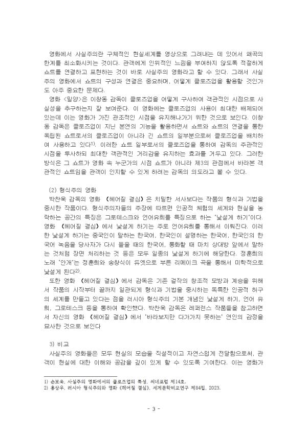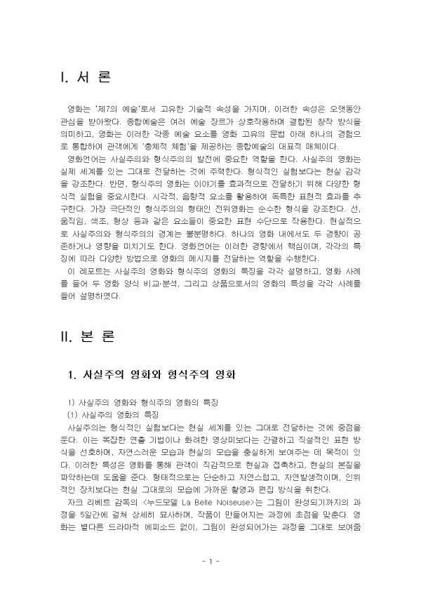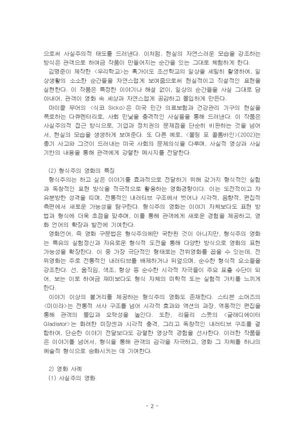 ¿µÈ´Â ¡®Á¦7ÀÇ ¿¹¼ú¡¯·Î¼ °íÀ¯ÇÑ ±â¼úÀû ¼Ó¼ºÀ» °¡Áö¸ç, ÀÌ·¯ÇÑ ¼Ó¼ºÀº ¿À·§µ¿¾È °ü½ÉÀ» ¹Þ¾Æ¿Ô´Ù. Á¾ÇÕ¿¹¼úÀº ¿©·¯ ¿¹¼ú À帣°¡ »óÈ£ÀÛ¿ëÇÏ¸ç °áÇÕµÈ Ã¢ÀÛ ¹æ½ÄÀ» ÀǹÌÇϰí, ¿µÈ´Â ÀÌ·¯ÇÑ °¢Á¾ ¿¹¼ú ¿ä¼Ò¸¦ ¿µÈ °íÀ¯ÀÇ ¹®¹ý ¾Æ·¡ ÇϳªÀÇ °æÇèÀ¸·Î ÅëÇÕÇÏ¿© °ü°´¿¡°Ô 'ÃÑüÀû üÇè'À» Á¦°øÇÏ´Â Á¾ÇÕ¿¹¼úÀÇ ´ëÇ¥Àû ¸ÅüÀÌ´Ù. ¿µÈ¾ð¾î´Â »ç½ÇÁÖÀÇ¿Í Çü½ÄÁÖÀÇÀÇ ¹ßÀü¿¡ Áß¿äÇÑ ¿ªÇÒÀ» ÇÑ´Ù. »ç½ÇÁÖÀÇ ¿µÈ´Â ½ÇÁ¦ ¼¼°è¸¦ ÀÖ´Â ±×´ë·Î Àü´ÞÇÏ´Â °Í¿¡ ÁÖ·ÂÇÑ´Ù. Çü½ÄÀûÀÎ ½ÇÇ躸´Ù´Â Çö½Ç °¨°¢À» °Á¶ÇÑ´Ù. ¹Ý¸é, Çü½ÄÁÖÀÇ ¿µÈ´Â À̾߱⸦ È¿°úÀûÀ¸·Î Àü´ÞÇϱâ À§ÇØ ´Ù¾çÇÑ Çü½ÄÀû ½ÇÇèÀ» Áß¿ä½ÃÇÑ´Ù. ½Ã°¢Àû, À½ÇâÀû ¿ä¼Ò¸¦ Ȱ¿ëÇÏ¿© µ¶Æ¯ÇÑ Ç¥ÇöÀû È¿°ú¸¦ Ãß±¸ÇÑ´Ù. °¡Àå ±Ø´ÜÀûÀÎ Çü½ÄÁÖÀÇÀÇ ÇüÅÂÀÎ ÀüÀ§¿µÈ´Â ¼ø¼öÇÑ Çü½ÄÀ» °Á¶ÇÑ´Ù. ¼±, ¿òÁ÷ÀÓ, »öÁ¶, Çü»ó µî°ú °°Àº ¿ä¼ÒµéÀÌ Áß¿äÇÑ Ç¥Çö ¼ö´ÜÀ¸·Î ÀÛ¿ëÇÑ´Ù. Çö½ÇÀûÀ¸·Î »ç½ÇÁÖÀÇ¿Í Çü½ÄÁÖÀÇÀÇ °æ°è´Â ºÒºÐ¸íÇÏ´Ù. ÇϳªÀÇ ¿µÈ ³»¿¡¼µµ µÎ °æÇâÀÌ °øÁ¸Çϰųª ¿µÇâÀ» ¹ÌÄ¡±âµµ ÇÑ´Ù. ¿µÈ¾ð¾î´Â ÀÌ·¯ÇÑ °æÇâ¿¡¼ ÇÙ½ÉÀ̸ç, °¢°¢ÀÇ Æ¯Â¡¿¡ µû¶ó ´Ù¾çÇÑ ¹æ¹ýÀ¸·Î ¿µÈÀÇ ¸Þ½ÃÁö¸¦ Àü´ÞÇÏ´Â ¿ªÇÒÀ» ¼öÇàÇÑ´Ù. ÀÌ ·¹Æ÷Æ®´Â »ç½ÇÁÖÀÇ ¿µÈ¿Í Çü½ÄÁÖÀÇ ¿µÈÀÇ Æ¯Â¡À» °¢°¢ ¼³¸íÇϰí, ¿µÈ »ç·Ê¸¦ µé¾î µÎ ¿µÈ ¾ç½Ä ºñ±³¡¤ºÐ¼®, ±×¸®°í »óǰÀ¸·Î¼ÀÇ ¿µÈÀÇ Æ¯¼ºÀ» °¢°¢ »ç·Ê¸¦ µé¾î ¼³¸íÇÏ¿´´Ù. II. º» ·Ð 1. »ç½ÇÁÖÀÇ ¿µÈ¿Í Çü½ÄÁÖÀÇ ¿µÈ 1) »ç½ÇÁÖÀÇ ¿µÈ¿Í Çü½ÄÁÖÀÇ ¿µÈÀÇ Æ¯Â¡ (1) »ç½ÇÁÖÀÇ ¿µÈÀÇ Æ¯Â¡ »ç½ÇÁÖÀÇ´Â Çü½ÄÀûÀÎ ½ÇÇ躸´Ù´Â Çö½Ç ¼¼°è¸¦ ÀÖ´Â ±×´ë·Î Àü´ÞÇÏ´Â °Í¿¡ ÁßÁ¡À» µÐ´Ù. ÀÌ´Â º¹ÀâÇÑ ¿¬Ãâ ±â¹ýÀ̳ª È·ÁÇÑ ¿µ»ó¹Ìº¸´Ù´Â °£°áÇϰí Á÷¼³ÀûÀΠǥÇö ¹æ½ÄÀ» ¼±È£Çϸç, ÀÚ¿¬½º·¯¿î ¸ð½À°ú Çö½ÇÀÇ ¸ð½ÀÀ» Ãæ½ÇÇÏ°Ô º¸¿©ÁÖ´Â µ¥ ¸ñÀûÀÌ ÀÖ´Ù. ÀÌ·¯ÇÑ Æ¯¼ºÀº ¿µÈ¸¦ ÅëÇØ °ü°´ÀÌ Á÷°¨ÀûÀ¸·Î Çö½Ç°ú Á¢ÃËÇϰí, Çö½ÇÀÇ º»ÁúÀ» ÆÄ¾ÇÇϴµ¥ µµ¿òÀ» ÁØ´Ù. ÇüÅÂÀûÀ¸·Î´Â ´Ü¼øÇϰí ÀÚ¿¬½º·´°í, ÀÚ¿¬¹ß»ýÀûÀ̸ç, ÀÎÀ§ÀûÀÎ ÀåÄ¡º¸´Ù´Â Çö½Ç ±×´ë·ÎÀÇ ¸ð½À¿¡ °¡±î¿î ÃÔ¿µ°ú ÆíÁý ¹æ½ÄÀ» ÃëÇÑ´Ù. ÀÚÅ© ¸®º£Æ® °¨µ¶ÀÇ <´©µå¸ðµ¨ La Belle Noiseuse>´Â ±×¸²ÀÌ ¿Ï¼ºµÇ±â±îÁöÀÇ °úÁ¤À» 5Àϰ£¿¡ °ÉÃÄ »ó¼¼È÷ ¹¦»çÇϸç, ÀÛǰÀÌ ¸¸µé¾îÁö´Â °úÁ¤¿¡ ÃÊÁ¡À» ¸ÂÃá´Ù. ¿µÈ´Â º°´Ù¸¥ µå¶ó¸¶Àû ¿¡ÇÇ¼Òµå ¾øÀÌ, ±×¸²ÀÌ ¿Ï¼ºµÇ¾î°¡´Â °úÁ¤À» ±×´ë·Î º¸¿©ÁÜÀ¸·Î½á »ç½ÇÁÖÀÇÀû ŵµ¸¦ µå·¯³½´Ù. ÀÌó·³, Çö½ÇÀÇ ÀÚ¿¬½º·¯¿î ¸ð½ÀÀ» °Á¶ÇÏ´Â ¹æ½ÄÀº °ü°´À¸·Î ÇÏ¿©±Ý ÀÛǰÀÌ ¸¸µé¾îÁö´Â ¼ø°£À» ÀÖ´Â ±×´ë·Î üÇèÇÏ°Ô ÇÑ´Ù. ±è¸íÁØÀÌ Á¦ÀÛÇÑ <¿ì¸®Çб³>´Â Ȥ°¡À̵µ Á¶¼±Çб³ÀÇ ÀÏ»óÀ» ¼¼¹ÐÈ÷ ÃÔ¿µÇÏ¿©, ÀÏ»ó»ýȰÀÇ ¼Ò¼ÒÇÑ ¼ø°£µéÀ» ÀÚ¿¬½º·´°Ô º¸¿©ÁÜÀ¸·Î½á Çö½ÇÀûÀ̰í Á÷¼³ÀûÀΠǥÇöÀ» ½ÇÇöÇÑ´Ù. ÀÌ ÀÛǰÀº ƯÁ¤ÇÑ À̾߱⳪ ÇØ¼³ ¾øÀÌ, ÀÏ»óÀÇ ¼ø°£µéÀ» »ç½Ç ±×´ë·Î ´ã¾Æ³»¾î, °ü°´ÀÌ ¿µÈ ¼Ó ¼¼»ó°ú ÀÚ¿¬½º·´°Ô °ø°¨ÇÏ°í ¸ôÀÔÇÏ°Ô ¸¸µç´Ù. ¸¶ÀÌŬ ¹«¾îÀÇ <½ÄÄÚ Sicko>Àº ¹Ì±¹ ¹Î°£ ÀǷẸÇè°ú °Ç°°ü¸® ±â±¸ÀÇ Çö½ÇÀ» Æø·ÎÇÏ´Â ´ÙÅ¥¸àÅ͸®·Î, »çȸ ¹Î³¸À» Ãæ°ÝÀûÀÎ »ç½ÇµéÀ» ÅëÇØ µå·¯³½´Ù. ÀÌ ÀÛǰÀº »ç½ÇÁÖÀÇÀû Á¢±Ù ¹æ½ÄÀ¸·Î, ±â¾÷°ú Á¤Ä¡±ÇÀÇ ¹®Á¦Á¡À» ´Ü¼øÈ÷ ºñÆÇÇÏ´Â °ÍÀ» ³Ñ¾î¼, Çö½ÇÀÇ ¸ð½ÀÀ» »ý»ýÇÏ°Ô º¸¿©ÁØ´Ù. ¶Ç ´Ù¸¥ ¿¹·Î, <º¼¸µ Æ÷ ÄÝ·Ò¹ÙÀÎ>(2002)´Â Ãѱ⠻ç°í¿Í ±×°ÍÀÌ µå·¯³»´Â ¹Ì±¹ »çȸÀÇ ¹®Á¦ÀǽÄÀ» ´Ù·ç¸ç, »ç½ÇÀû ¿µ»ó°ú »ç½Ç ±â¹ÝÀÇ ³»¿ëÀ» ÅëÇØ °ü°´¿¡°Ô °·ÄÇÑ ¸Þ½ÃÁö¸¦ Àü´ÞÇÑ´Ù. (2) Çü½ÄÁÖÀÇ ¿µÈÀÇ Æ¯Â¡ Çü½ÄÁÖÀÇ´Â ÇÏ°í ½ÍÀº À̾߱⸦ È¿°úÀûÀ¸·Î Àü´ÞÇϱâ À§ÇØ °®°¡Áö Çü½ÄÀûÀÎ ½ÇÇè°ú µ¶Ã¢ÀûÀΠǥÇö ¹æ½ÄÀ» Àû±ØÀûÀ¸·Î Ȱ¿ëÇÏ´Â ¿µÈ°æÇâÀÌ´Ù. ÀÌ´Â µµÀüÀûÀ̰í ÀÚÀ¯ºÐ¹æÇÑ ¼º°ÝÀ» ¶ì¸ç, ÀüÅëÀûÀÎ ³»·¯Æ¼ºê ±¸Á¶¿¡¼ ¹þ¾î³ª ½Ã°¢Àû, À½ÇâÀû, ÆíÁýÀû Ãø¸é¿¡¼ »õ·Î¿î °¡´É¼ºÀ» ޱ¸ÇÑ´Ù. Çü½ÄÁÖÀÇ ¿µÈ´Â À̾߱â ÀÚüº¸´Ùµµ Ç¥Çö ¹æ¹ý°ú Çü½Ä¿¡ ´õ¿í ÃÊÁ¡À» ¸ÂÃ߸ç, À̸¦ ÅëÇØ °ü°´¿¡°Ô »õ·Î¿î °æÇèÀ» Á¦°øÇϰí, ¿µÈ ¾ð¾îÀÇ È®Àå°ú ¹ßÀü¿¡ ±â¿©ÇÑ´Ù. ¿µÈ¾ð¾î, Áï ¿µÈ ±¸¹®¹ýÀº Çü½ÄÁÖÀÇ¿¡¸¸ ±¹ÇÑµÈ °ÍÀÌ ¾Æ´ÏÁö¸¸, Çü½ÄÁÖÀÇ ¿µÈ´Â ƯÀ¯ÀÇ ½ÇÇèÁ¤½Å°ú ÀÚÀ¯·Î¿î Çü½ÄÀû µµÀü