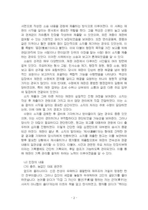 ¼ö·ÉÀÌ ¼ÒÁö¸¦ °ËÅäÇÑ ÈÄ °ð¹Ù·Î ±â°¢Çϰųª ¹Þ¾ÆµéÀÌÁö ¾Ê´Â °æ¿ìµµ Á¾Á¾ ÀÖ¾úÀ¸¸ç, ÀÌ´Â »ç¾ÈÀÌ °æ¹ÌÇϰųª ºÎÀûÇÕÇÏ´Ù°í ÆÇ´ÜµÇ¾úÀ» °¡´É¼ºÀ» º¸¿©ÁØ´Ù. ±×·¯³ª ´ç»çÀÚ °£ ´ëÁúÀÌ ÇÊ¿äÇÏ´Ù°í ÆÇ´ÜµÈ´Ù¸é, ¿ø°í´Â ÇÇ°í¸¦ ´ëµ¿ÇÏ¿© °üû¿¡ ´Ù½Ã ÃâµÎÇÏ¿© ½É¸®¸¦ ÁøÇàÇÏ¿´´Ù. ÀÌ·¸°Ô °£´ÜÇÑ ´ëÁú ½É¹®¸¸À¸·Î ´ëºÎºÐÀÇ ¼Û»ç°¡ Á¾°áµÇ°ï ÇÏ¿´´Ù. ÀçÆÇÀÌ ³¡³­ ÈÄ, ¼ÒÁöÀÇ ¸»¹Ì¿¡´Â 'Á¦»ç(î®Þö)'¶ó´Â ÇüÅ·Π°£·«ÇÑ ÆÇ°á °á°ú¸¦ ±âÀçÇÏ¿© ´ç»çÀÚ¿¡°Ô ¹ÝȯÇÏ¿´´Ù. ¼ÒÁö¸¦ Á¦ÃâÇÑ ¿ø°í´Â À̸¦ º¸°üÇÏ¿© ÇâÈÄ ÇÊ¿äÇÑ »óȲ¿¡¼­ Àç»ç¿ëÇϰųª Áõ°Å¹°·Î Á¦ÃâÇÔÀ¸·Î½á ÀçÆÇÀÇ ¿¬¼Ó¼º°ú ÆÇ°á ³»¿ëÀÇ Àϰü¼ºÀ» À¯ÁöÇÒ ¼ö ÀÖ¾ú´Ù. ´õºÒ¾î, »ç°Ç°ú °ü·ÃµÈ ÁÖ¿ä 󸮴 ¹ÎÀåÄ¡ºÎÃ¥À̶ó´Â ±â·Ï¹°¿¡µµ °£´ÜÈ÷ ±â·ÏµÇ¾î, ÈÄÀÏ ÂüÁ¶°¡ °¡´ÉÇϵµ·Ï °ü¸®µÇ¾ú´Ù. À̸¦ ÅëÇØ ÀçÆÇÀÇ ±â·Ï °ü¸®¸¦ öÀúÈ÷ ÇÏ·Á´Â ³ë·ÂÀÌ ÀÌ·ç¾îÁ³À½À» ¾Ë ¼ö ÀÖ´Ù.