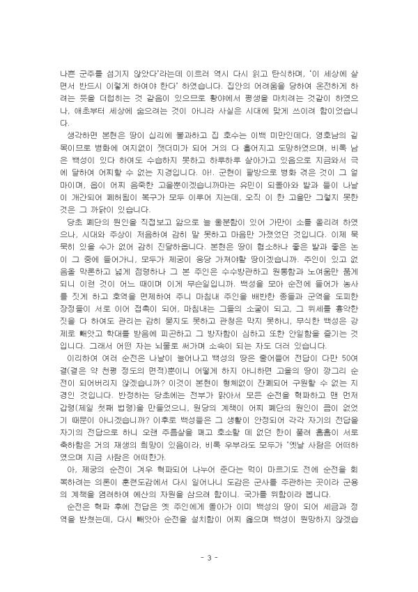 ³ª´Â Á¶¼± ½Ã´ë, ÃæÁÖ Áö¿ª¿¡ °ÅÁÖÇÏ¸ç »ýȰÇϰí ÀÖ´Â À±¿¬ÁÖ¶ó´Â »ç¶÷ÀÌ´Ù. ³» ÁÖ¿ä »ý¾÷Àº ³ó¾÷À¸·Î, ³í¹çÀ» Àϱ¸°í ÀÛ¹°À» Àç¹èÇÏ´Â ³ó»çÀÏ¿¡ Á¾»çÇÏ¸ç »ý°è¸¦ À̾°í ÀÖ´Ù. ³ªÀÇ °¡Á· ±¸¼º¿øÀº ºÎ¸ð´Ô, ¾Æ³», ±×¸®°í ¼ÒÁßÇÑ µÎ ¾Æµé°ú µÎ µþ±îÁö ¸ðµÎ ÇÕÃÄ ÃÑ ¿©´ü ¸íÀ̶ó´Â ´ë°¡Á·À¸·Î ÀÌ·ç¾îÁ® ÀÖ´Ù. ±×·¯³ª °¡Á·ÀÌ ÀÇÁöÇÒ¸¸ÇÑ ³óÅä°¡ ³Ë³ËÇÏÁö ¾Ê¾Æ, ÀÚ°¡³óÀÌ ¾Æ´Ñ ¼ÒÀÛ³óÀ¸·Î »ì¾Æ°¡°í ÀÖ´Ù. ¼ÒÀÛ³óÀº ´Ù¸¥ »ç¶÷ÀÇ ¶¥À» ºô·Á ³ó»ç¸¦ Áþ°í, ±× ´ë°¡·Î ¼öÈ®¹°À» »ó´ç ºÎºÐ ¹ÙÄ¡¸ç »ýÈ°ÇØ¾ß Çϱ⠶§¹®¿¡ °æÁ¦ÀûÀ¸·Î ±ÃÇÌÇϰí Èûµç »óȲ¿¡ Ã³ÇØ ÀÖ´Ù. ÀÌ·± ¾î·Á¿î »óȲ ¼Ó¿¡¼­µµ °¡Á· ¸ðµÎ ÀÇÁöÇÏ¸ç ¼º½ÇÈ÷ »ì¾Æ°¡°íÀÚ ³ë·ÂÇϰí ÀÖ´Ù.