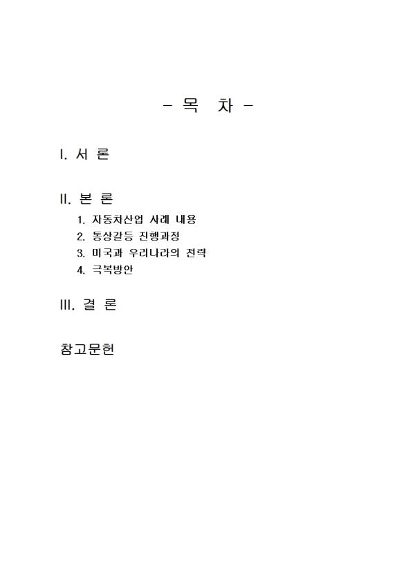 - ¸ñ Â÷ - I. ¼ ·Ð II. º» ·Ð 1. ÀÚµ¿Â÷»ê¾÷ »ç·Ê ³»¿ë 2. Åë»ó°¥µî ÁøÇà°úÁ¤ 3. ¹Ì±¹°ú ¿ì¸®³ª¶óÀÇ Àü·« 4. ±Øº¹¹æ¾È III. °á ·Ð Âü°í¹®Çå ** ÇÔ²² Á¦°øµÇ´Â Âü°íÀÚ·á ÇÑ±ÛÆÄÀÏ ** 1. »ç·Ê ³»¿ë - ÀÚµ¿Â÷.hwp 2. »ç·Ê ³»¿ë - ¹ÝµµÃ¼.hwp 3. Åë»ó°¥µîÀÇ ÁøÇà°úÁ¤.hwp 4. Åë»ó°¥µîÀÇ ÁøÇà°úÁ¤2.hwp 5. ¹Ì±¹°ú ¿ì¸®³ª¶óÀÇ Àü·«.hwp 6. ¹Ì±¹°ú ¿ì¸®³ª¶óÀÇ Àü·«2.hwp 7. ±Øº¹¹æ¾È.hwp 8. ±Øº¹¹æ¾È2.hwp 9. ¼·Ð ÀÛ¼º½Ã ÂüÁ¶.hwp 10. °á·Ð ÀÛ¼º½Ã ÂüÁ¶.hwp 11. ¼·Ð ÀÛ¼º½Ã ÂüÁ¶2.hwp 12. °á·Ð ÀÛ¼º½Ã ÂüÁ¶2.hwp ¢ºÀÚ·á³»¿ë ¹Ì¸®º¸±â