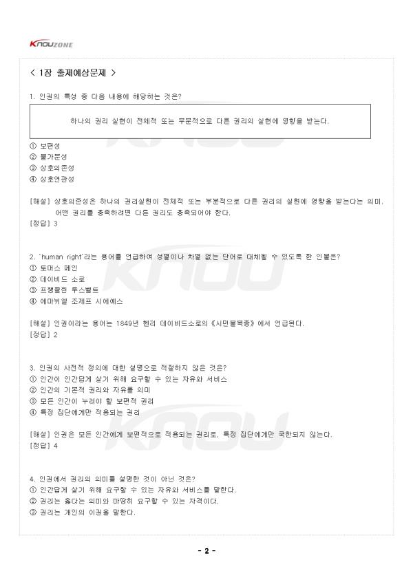 1. ÀαÇÀÇ °³³ä 1) ÀαÇÀ̶õ ¨ç ÀαÇÀ̶ó´Â ¿ë¾î´Â Ç µ¥À̺ñµå ¼Ò·ÎÀÇ Àú¼ ¡¶½Ã¹Î ºÒº¹Á¾¡·(1849)¿¡¼ ¾ð±ÞµÊ ¨è ±Ç¸®ÀÇ »çÀüÀû Àǹ̴ ¡°Àΰ£ÀÌ Àΰ£´ä°Ô »ì±â À§ÇØ ¿ä±¸ÇÒ ¼ö ÀÖ´Â ÀÚÀ¯¿Í ¼ºñ½º¡±ÀÓ ¨é Áß¼¼ ÀÌÈÄ·Î ±Ç¸®´Â »çȸ°è¾à·Ð¿¡ ÀÇÇØ¼ Àΰ£ÀÌ ¸¶¶¥È÷ Çà»çÇÏ°í ¿ä±¸ÇÒ ¼ö ÀÖ´Ù°í ÀÎÁ¤µÇ´Â ¾î¶² Ưº°ÇÑ ÀÚ°ÝÀ̶ó°í ÀνĵǾúÀ½ ¨ê ÀÌ·¯ÇÑ Àǹ̴ ¼¼°èÀαǼ±¾ð¹® Àü¹®°ú Á¦1Á¶, ¡¸´ëÇѹα¹Çå¹ý¡¹ Á¦10Á¶¿¡µµ ´ã°Ü ÀÖÀ½ ¨ë ÀÌ·¸µí ÀαÇÀº Ãß»óÀû °³³äÀ¸·Î¸¸ Á¸ÀçÇÏ´Â °ÍÀÌ ¾Æ´Ï¶ó ´Ù¾çÇÑ ¹®Çå°ú Á¦µµ¿¡¼ ÀαÇÀ» ¸í½ÃÇϰí ÀÖÀ½ 2. ÀÚ¿¬¹ý»ç»ó°ú À뱂 1) ÀÚ¿¬¹ý»ç»ó ¨ç ÀÚ¿¬±ÇÀû ÀαÇÀº Àΰ£À̶ó´Â »ç½Ç Çϳª¸¸À¸·Î °¡Áú ¼ö ÀÖ´Â ±âº» ±Ç¸®ÀÓ ¨è ÀÚ¿¬±ÇÀû ÀαÇÀº ±¹°¡³ª ±Ç·Â¿¡ ÀÇÇØ¼ Ä§ÇØ¸¦ ¹ÞÁö ¾Ê´Â ±Ç¸®ÀÓ ¨é ÀαÇÀº °³º° Àΰ£À̳ª ƯÁ¤ÇÑ Áý´ÜÀÌ ¾Æ´Ï¶ó ÀÚ¿¬ÀÌ ±ÔÁ¤ÇÏ¸ç º¸ÆíÀûÀ¸·Î Àû¿ëµÉ ¼ö Àֱ⠶§¹®¿¡ ¿ÇÀº °ÍÀÓ ¨ê ¾Æ¸®½ºÅäÅÚ·¹½º´Â ±Ç¸®¶õ Àΰ£¿¡°Ô Àû¿ëµÈ ÀÚ¿¬¹ýÀ̰í, ÀÚ¿¬¹ý¿¡ µû¶ó ¸ðµç Àΰ£ÀÌ ±Ç¸®¸¦ °¡Áø´Ù´Â °ÍÀº À̼ºÀûÀÌ¸ç ¿Ã¹Ù¸¥ °ÍÀ̶ó°í ¸»ÇÔ ¨ë ÀÚ¿¬¹ý»ç»óÀº ±â¿øÀü 3¼¼±â¿¡ °í´ë ±×¸®½ºÀÇ ½ºÅ侯ÇÐÆÄ¿¡¼ ¹ßÀüµÇ¾úÀ½ ¨ì ¾Æ¸®½ºÅäÅÚ·¹½º´Â ÀÚ¿¬Àû Á¤ÀÇ¿Í ¹ýÀû Á¤ÀÇ ¾çÀÚ°¡ Ç×»ó ÀÏÄ¡ÇÏ´Â °ÍÀº ¾Æ´ÏÁö¸¸ ÀÚ¿¬Àû Á¤Àǰ¡ ¹ýÀû Á¤ÀǺ¸´Ù ¿ìÀ§¿¡ ÀÖ´Ù°í ÁÖÀåÇÔ ¨í ÀÚ¿¬Àû Á¤ÀÇ´Â ¾ÈƼ°í³×°¡ ÁÖÀåÇÑ ÀÚ¿¬¹ýÀÌ°í ¹ýÀû Á¤ÀÇ´Â Å©·¹¿ÂÀÌ ÁÖÀåÇÑ ½ÇÁ¤¹ýÀÓ ¨î Àΰ£ÀÇ ÀαÇÀ̶ó´Â °Í, ¸ðµç Àΰ£ÀÌ¸é ´©·Á¾ß ÇÒ ±Ç¸®°¡ »ç»óÀûÀ¸·Îµµ ¹ßÀüÇØ ¿ÔÀ½ 3. ÀαÇÀÇ Æ¯¼º 1) Ư¼º ¨ç ÀαÇÀº º¸ÆíÀûÀ̶ó´Â Ư¼ºÀÌ ÀÖÀ½ ¨è ±¹Àû°ú ½ÅºÐ¿¡ »ó°ü¾øÀÌ ¸ðµç Àΰ£ÀÌ ´©¸± ¼ö ÀÖ´Â ±Ç¸®·Î ž ¶§ºÎÅÍ µ¿µîÇϰí Á¸¾öÀ» º¸Àå¹Þ´Â ¼¼°èÀαǼ±¾ðÀÇ Á¤½ÅÀ» ´ã°í ÀÖÀ½ ¨é ÀαÇÀÇ º¸Æí¼º¿¡ ÀÚ¿¬±ÇÀû¡¤ÃµºÎÀαÇÀû, ÀÚ¿¬¹ý»ç»óÀÇ ³»¿ëÀÌ ¹Ý¿µµÇ¾î ÀÖÀ½ ¨ê ÀαÇÀº ºÒ°¡ºÐÀûÀ̶ó´Â Ư¼ºÀÌ ÀÖÀ½ ¨ë ÀαÇÀº ºÐ¸®µÉ ¼ö ¾ø°í ±Ç¸®´Â µ¿µîÇϸç À§°èÀûÀ¸·Î ¼øÀ§³ª ¿ì¼±¼ºÀ» ºÎ¿©ÇÒ ¼ö ¾øÀ½À» ÀǹÌÇÔ ¨ì Àαǿ¡´Â ÀÚÀ¯±Ç, Á¤Ä¡±Ç, »çȸ±Ç, °³ÀÎÀÇ ±Ç¸®, Áý´ÜÀÇ ±Ç¸® µîÀÌ Àִµ¥ ÀÌ ±Ç¸®´Â ½ÇÁ¦ ³ª´ ¼ö ¾ø°í, ³ª´²Áú ¼ö ¾ø´Ù°í º¸´Â °ÍÀÓ ¨í ÀαÇÀº »óÈ£ÀÇÁ¸ÀûÀÌ°í ¼·Î ¿¬°üµÇ¾î ÀÖÀ½ ¨î ÇϳªÀÇ ±Ç¸® ½ÇÇöÀÌ Àüü ¶Ç´Â ºÎºÐÀ¸·Î ´Ù¸¥ ±Ç¸® ½ÇÇö¿¡ ¿µÇâÀ» ¹Þ°í, ³ªÀÇ ±Ç¸®¿Í »ó´ë¹æÀÇ ±Ç¸®°¡ ¿¬°üµÇ¾î ÀÖ°í ÀÇÁ¸ÀûÀÓ ¨ï ÀαÇÀÇ Ä§ÇØ´Â ÇÊ¿¬ÀûÀ¸·Î ´Ù¸¥ ÂÊÀÇ ÀαÇÄ§ÇØ·Î À̾îÁö±â ¶§¹®¿¡ °³°³ÀÎÀÇ ÀαÇÀ» ÁõÁøÇÏ·Á¸é ÀÚÀ¯±Ç°ú »çȸ±ÇÀ» µ¿½Ã¿¡ º¸ÀåÇØ¾ß ÇÔ < 1Àå ÃâÁ¦¿¹»ó¹®Á¦ > 1. ÀαÇÀÇ Æ¯¼º Áß ´ÙÀ½ ³»¿ë¿¡ ÇØ´çÇÏ´Â °ÍÀº? ÇϳªÀÇ ±Ç¸® ½ÇÇöÀÌ ÀüüÀû ¶Ç´Â ºÎºÐÀûÀ¸·Î ´Ù¸¥ ±Ç¸®ÀÇ ½ÇÇö¿¡ ¿µÇâÀ» ¹Þ´Â´Ù. ¨ç º¸Æí¼º ¨è ºÒ°¡ºÐ¼º ¨é »óÈ£ÀÇÁ¸¼º ¨ê »óÈ£¿¬°ü¼º [ÇØ¼³] »óÈ£ÀÇÁ¸¼ºÀº ÇϳªÀÇ ±Ç¸®½ÇÇöÀÌ ÀüüÀû ¶Ç´Â ºÎºÐÀûÀ¸·Î ´Ù¸¥ ±Ç¸®ÀÇ ½ÇÇö¿¡ ¿µÇâÀ» ¹Þ´Â´Ù´Â ÀǹÌ. ¾î¶² ±Ç¸®¸¦ ÃæÁ·ÇÏ·Á¸é ´Ù¸¥ ±Ç¸®µµ ÃæÁ·µÇ¾î¾ß ÇÑ´Ù. [Á¤´ä] 3 2. ¡®human right¡¯¶ó´Â ¿ë¾î¸¦ ¾ð±ÞÇÏ¿© ¼ºº°À̳ª Â÷º° ¾ø´Â ´Ü¾î·Î ´ëüµÉ ¼ö ÀÖµµ·Ï ÇÑ Àι°Àº? ¨ç Åä¸Ó½º ÆäÀÎ ¨è µ¥À̺ñµå ¼Ò·Î ¨é ÇÁ·©Å¬¸° ·ç½ºº§Æ® ¨ê ¿¡¸¶´µ¿¤ Á¶Á¦ÇÁ ½Ã¿¡¿¹½º [ÇØ¼³] ÀαÇÀ̶ó´Â ¿ë¾î´Â 1849³â Ç µ¥À̺ñµå¼Ò·ÎÀÇ¡¶½Ã¹ÎºÒº¹Á¾¡·¿¡¼ ¾ð±ÞµÈ´Ù. [Á¤´ä] 2 - Áß·« - |