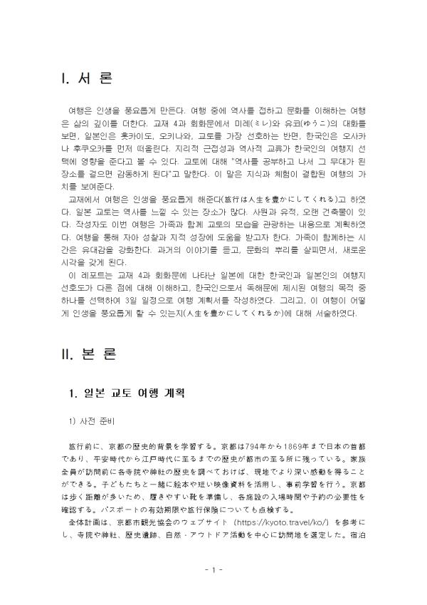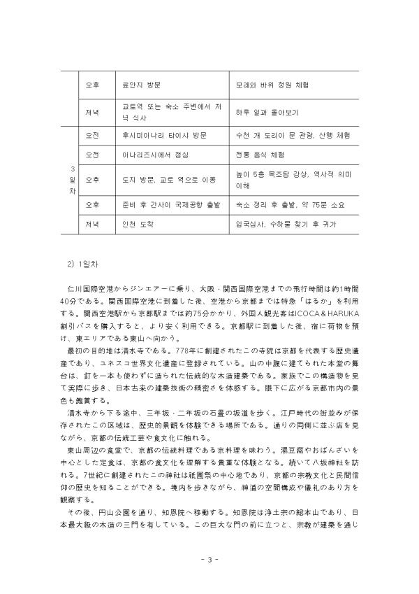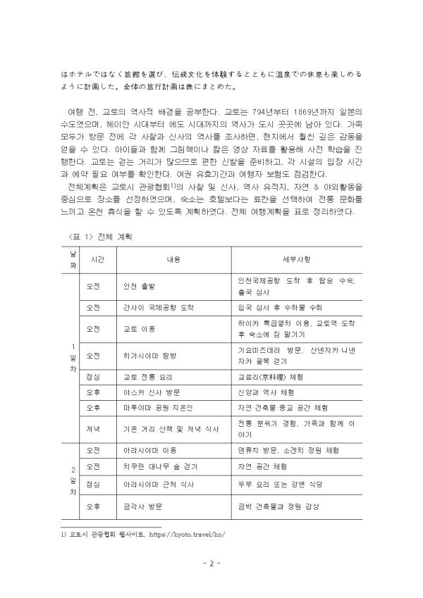 ¿©ÇàÀº ÀλýÀ» dz¿ä·Ó°Ô ¸¸µç´Ù. ¿©Çà Áß¿¡ ¿ª»ç¸¦ Á¢ÇÏ°í ¹®È¸¦ ÀÌÇØÇÏ´Â ¿©ÇàÀº »îÀÇ ±íÀ̸¦ ´õÇÑ´Ù. ±³Àç 4°ú ȸȹ®¿¡¼ ¹Ì·¹(«ß«ì)¿Í À¯ÄÚ(ªæª¦ª³)ÀÇ ´ëȸ¦ º¸¸é, ÀϺ»ÀÎÀº ȪīÀ̵µ, ¿ÀŰ³ª¿Í, ±³Å並 °¡Àå ¼±È£ÇÏ´Â ¹Ý¸é, Çѱ¹ÀÎÀº ¿À»çÄ«³ª ÈÄÄí¿ÀÄ«¸¦ ¸ÕÀú ¶°¿Ã¸°´Ù. Áö¸®Àû ±ÙÁ¢¼º°ú ¿ª»çÀû ±³·ù°¡ Çѱ¹ÀÎÀÇ ¿©ÇàÁö ¼±Åÿ¡ ¿µÇâÀ» ÁØ´Ù°í º¼ ¼ö ÀÖ´Ù. ±³Åä¿¡ ´ëÇØ "¿ª»ç¸¦ °øºÎÇÏ°í ³ª¼ ±× ¹«´ë°¡ µÈ Àå¼Ò¸¦ °ÉÀ¸¸é °¨µ¿ÇÏ°Ô µÈ´Ù"°í ¸»ÇÑ´Ù. ÀÌ ¸»Àº Áö½Ä°ú üÇèÀÌ °áÇÕµÈ ¿©ÇàÀÇ °¡Ä¡¸¦ º¸¿©ÁØ´Ù. ±³Àç¿¡¼ ¿©ÇàÀº ÀλýÀ» dz¿ä·Ó°Ô ÇØÁØ´Ù(Õéú¼ªÏìÑßæªòù¥ª«ªËª·ªÆª¯ªìªë)°í ÇÏ¿´´Ù. ÀϺ» ±³Åä´Â ¿ª»ç¸¦ ´À³¥ ¼ö ÀÖ´Â Àå¼Ò°¡ ¸¹´Ù. »ç¿ø°ú À¯Àû, ¿À·£ °ÇÃ๰ÀÌ ÀÖ´Ù. ÀÛ¼ºÀÚµµ À̹ø ¿©ÇàÀº °¡Á·°ú ÇÔ²² ±³ÅäÀÇ ¸ð½ÀÀ» °ü±¤ÇÏ´Â ³»¿ëÀ¸·Î °èȹÇÏ¿´´Ù. ¿©ÇàÀ» ÅëÇØ ÀÚ¾Æ ¼ºÂû°ú ÁöÀû ¼ºÀå¿¡ µµ¿òÀ» ¹Þ°íÀÚ ÇÑ´Ù. °¡Á·ÀÌ ÇÔ²²ÇÏ´Â ½Ã°£Àº À¯´ë°¨À» °ÈÇÑ´Ù. °ú°ÅÀÇ À̾߱⸦ µè°í, ¹®ÈÀÇ »Ñ¸®¸¦ »ìÇǸé¼, »õ·Î¿î ½Ã°¢À» °®°Ô µÈ´Ù. ÀÌ ·¹Æ÷Æ®´Â ±³Àç 4°ú ȸȹ®¿¡ ³ªÅ¸³ ÀϺ»¿¡ ´ëÇÑ Çѱ¹Àΰú ÀϺ»ÀÎÀÇ ¿©ÇàÁö ¼±È£µµ°¡ ´Ù¸¥ Á¡¿¡ ´ëÇØ ÀÌÇØÇϰí, Çѱ¹ÀÎÀ¸·Î¼ µ¶Çع®¿¡ Á¦½ÃµÈ ¿©ÇàÀÇ ¸ñÀû Áß Çϳª¸¦ ¼±ÅÃÇÏ¿© 3ÀÏ ÀÏÁ¤À¸·Î ¿©Çà °èȹ¼¸¦ ÀÛ¼ºÇÏ¿´´Ù. ±×¸®°í, ÀÌ ¿©ÇàÀÌ ¾î¶»°Ô ÀλýÀ» dz¿ä·Ó°Ô ÇÒ ¼ö ÀÖ´ÂÁö(ìÑßæªòù¥ª«ªËª·ªÆª¯ªìªëª«)¿¡ ´ëÇØ ¼¼úÇÏ¿´´Ù. II. º» ·Ð 1. ÀϺ» ±³Åä ¿©Çà °èȹ 1) »çÀü Áغñ Õéú¼îñªË¡¢ÌÈÔ´ªÎ歴ÞÈîÜÛÎÌØªò学㧪¹ªë¡£ÌÈÔ´ªÏ794Ò´ª«ªé1869Ò´ªÞªÇìíÜâªÎâÏÔ´ªÇª¢ªê¡¢øÁäÌãÁÓÛª«ªé˰戸ãÁÓÛªËò¸ªëªÞªÇªÎ歴ÞȪ¬Ô´ã¼ªÎò¸ªëᶪË残ªÃªÆª¤ªë¡£Ê«ðéîïꬪ¬Û¾ÙýîñªËÊÀÞÑêªäãêÞäªÎ歴ÞȪòðàªÙªÆªªª±ªÐ¡¢úÞò¢ªÇªèªê䢪¤ÊïÔѪòÔðªëª³ªÈª¬ªÇªªë¡£íªÉªâª¿ªÁªÈìé緒ªË絵ÜâªäÓª¤ç±ßÀíÀÖùªòüÀéĪ·¡¢ÞÀîñ学㧪òú¼ª¦¡£ÌÈÔ´ªÏ歩ª¯Ëå×Òýª¤ª¿ªá¡¢×Ûªªäª¹ª¤ü¨ªòñÞÝ᪷¡¢ÊÀã¿àâªÎìýíÞãÁÊàªäåøå³ªÎù±é©àõªòü¬ì㪹ªë¡£«Ñ«¹«Ýー«ÈªÎêó効Ñ¢ùÚªäÕéú¼ÜÁ険ªËªÄª¤ªÆªâïÃ検ª¹ªë¡£ îï体ͪ画ªÏ¡¢ÌÈÔ´ã¼観ÎÃúð会ªÎ«¦«§«Ö«µ«¤«È£¨https://kyoto.travel/ko/£©ªò参ÍŪ˪·¡¢ÞÑêªäãêÞä¡¢歴ÞÈë¶îæ¡¢í»æÔ・«¢«¦«È«É«¢üÀÔѪòñéãýªËÛ¾Ùýò¢ªòàÔïÒª·ª¿¡£âÖÚժϫ۫ƫëªÇªÏªÊª¯ÕéνªòàÔªÓ¡¢伝÷ÖÙþûùªò体験ª¹ªëªÈªÈªâªË温ô»ªÇªÎýÌãÓªâ楽ª·ªáªëªèª¦ªËͪ画ª·ª¿¡£îï体ªÎÕéú¼Íª画ªÏøúªËªÞªÈªáª¿¡£ ¿©Çà Àü, ±³ÅäÀÇ ¿ª»çÀû ¹è°æÀ» °øºÎÇÑ´Ù. ±³Åä´Â 794³âºÎÅÍ 1869³â±îÁö ÀϺ»ÀÇ ¼öµµ¿´À¸¸ç, ÇìÀÌ¾È ½Ã´ëºÎÅÍ ¿¡µµ ½Ã´ë±îÁöÀÇ ¿ª»ç°¡ µµ½Ã °÷°÷¿¡ ³²¾Æ ÀÖ´Ù. °¡Á· ¸ðµÎ°¡ ¹æ¹® Àü¿¡ °¢ »çÂû°ú ½Å»çÀÇ ¿ª»ç¸¦ Á¶»çÇϸé, ÇöÁö¿¡¼ ÈξÀ ±íÀº °¨µ¿À» ¾òÀ» ¼ö ÀÖ´Ù. ¾ÆÀ̵é°ú ÇÔ²² ±×¸²Ã¥À̳ª ªÀº ¿µ»ó ÀڷḦ Ȱ¿ëÇØ »çÀü ÇнÀÀ» ÁøÇàÇÑ´Ù. ±³Åä´Â °È´Â °Å¸®°¡ ¸¹À¸¹Ç·Î ÆíÇÑ ½Å¹ßÀ» ÁغñÇϰí, °¢ ½Ã¼³ÀÇ ÀÔÀå ½Ã°£°ú ¿¹¾à ÇÊ¿ä ¿©ºÎ¸¦ È®ÀÎÇÑ´Ù. ¿©±Ç À¯È¿±â°£°ú ¿©ÇàÀÚ º¸Çèµµ Á¡°ËÇÑ´Ù. Àüü°èȹÀº ±³Åä½Ã °ü±¤Çùȸ ±³Åä½Ã °ü±¤Çùȸ À¥»çÀÌÆ®, https://kyoto.travel/ko/ ÀÇ »çÂû ¹× ½Å»ç, ¿ª»ç À¯ÀûÁö, ÀÚ¿¬ & ¾ß¿ÜȰµ¿À» Áß½ÉÀ¸·Î Àå¼Ò¸¦ ¼±Á¤ÇÏ¿´À¸¸ç, ¼÷¼Ò´Â È£ÅÚº¸´Ù´Â ·áÄÀ» ¼±ÅÃÇÏ¿© ÀüÅë ¹®È¸¦ ´À³¢°í ¿Âõ ÈÞ½ÄÀ» ÇÒ ¼ö ÀÖµµ·Ï °èȹÇÏ¿´´Ù. Àüü ¿©Çà°èȹÀ» Ç¥·Î Á¤¸®ÇÏ¿´´Ù. - Áß·« - |