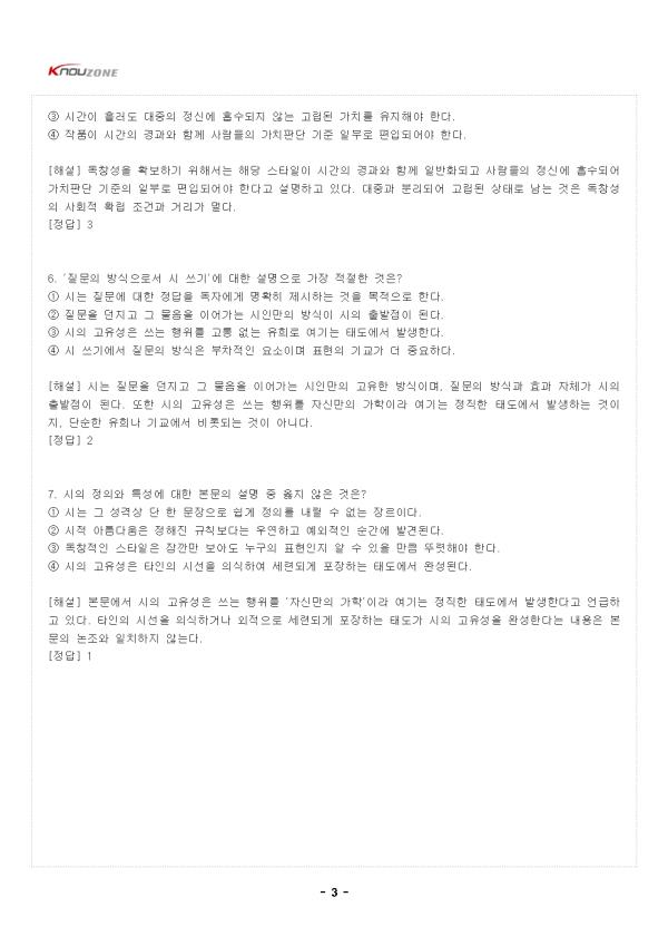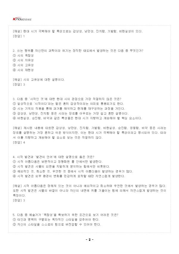 1. ½ÃÀûÀÎ °Í¿¡ ´ëÇÑ ÀÌÇØ 1) ½ÃÀûÀÎ °Í ¨ç ÀÏ»ó»ýȰ¿¡¼ ½ÃÀûÀÌ´Ù¶ó´Â ¸»Àº ÈçÈ÷ °¨¼ºÀûÀÌ´Ù¶ó´Â ¸»·Î Åë¿ëµÇ°í´Â ÇÔ ¨è ³¶¸¸Àû Á¤¼¸¦ Ç¥ÇöÇϴµ¥ ½Ã¶ó´Â À帣°¡ À¯È¿ÇÏ´Ù´Â »ý°¢ÀÌ ±î·Á ÀÖÀ½ ¨é °¨»ó¼º, ³¶¸¸¼º, ÁøÁöÇÔ, ±â¹ßÇÔ, ºñÇö½Ç¼º, ¼øÁøÇÔ, ¾û¶×ÇÔ, ºñ¾à µîÀº ½Ã¶ó´Â À帣¸¦ ¾Æ¿ì¸£´Â °¡Àå ÈçÇÏ°í ½¬¿î ¼³¸íÀÌ µÇ°ÚÁö¸¸ Çö´ë ½Ã°¡ ±Øº¹ÇØ¾ß ÇÒ Æ¯¼ºÀÓ ¨ê ±â¾ïÀÇ ÀÛ¿ëÀ» ÅëÇØ ½Ã´Â °ú°Å¸¦ ÇØ¼®Çϰí ÇöÀ縦 À籸¼ºÇسª°¨ ¨ë ½Ã´Â ½±°Ô Á¤Àdz»¸± ¼ö ¾øÀ½ 2. ½Ã¿Í ¹ß°ßÀÇ ¾ð¾î 1) ¹ß°ßÀÇ ¾ð¾î ¨ç ½ÃÀû ¾Æ¸§´Ù¿òÀ̶õ Á¤ÇØÁ® ÀÖ´Â °ÍÀÌ ¾Æ´Ï¶ó ¿¹¿ÜÀûÀÎ °Í, Èñ¼ÒÇÑ °Í, ¿ì¿¬ÇÑ °Í¿¡¼ ¹ß»ýÇÏ´Â °æ¿ì°¡ ¸¹À½ ¨è ½ÃÀû ¹ß°ßÀ̶õ »ç¹°ÀÇ ¹Ù±ùÀÌ ¾Æ´Ï¶ó ÀÚ½ÅÀÇ ³»¸é¿¡ ±Í ±â¿ïÀÌ´Â Èû¿¡ ÀÇÇØ¼ ÀÚ¿¬½º·´°Ô ¹ß»ýÇϰí´Â ÇÔ 3. µ¶Ã¢¼ºÀ̶õ ¹«¾ùÀΰ¡ 1) µ¶Ã¢¼º ¨ç ¿¹¼ú°¡°¡ µ¶Ã¢¼ºÀ» ¾î¶»°Ô È®º¸ÇÏ°Ô µÇ´Â°¡ - ´Ù¸¥ Ç¥ÇöÀÚ¿Í´Â ¸í¹éÈ÷ ´Ù¸¥ µ¶ÀÚÀûÀÎ ½ºÅ¸ÀÏÀ» °®°í ÀÖ¾î¼ Àá±ñ º¸¸é ±× »ç¶÷ÀÇ Ç¥ÇöÀ̶ó°í ¼ø½Ä°£¿¡ ÀÌÇØÇÒ ¼ö ÀÖ¾î¾ß ÇÔ - ½ºÅ¸ÀÏÀ» ½º½º·ÎÀÇ ÈûÀ¸·Î ¹öÀü¾÷ÇÒ ¼ö ÀÖ¾î¾ß ÇÔ - ½Ã°£ÀÇ °æ°ú¿Í ÇÔ²² ÀϹÝÈÇÏ°í »ç¶÷µéÀÇ Á¤½Å¿¡ Èí¼öµÇ¾î °¡Ä¡ÆÇ´Ü ±âÁØÀÇ ÀϺηΠÆíÀԵǾî¾ß ÇÔ 4. Áú¹®ÀÇ ¹æ½ÄÀ¸·Î¼ ½Ã ¾²±â 1) Áú¹®ÀÇ ¹æ½ÄÀ¸·Î ¾²±â ¨ç Áú¹®ÀÇ ¹æ½Ä°ú È¿°ú´Â ½ÃÀÇ Ãâ¹ßÁ¡ÀÌ µÊ ¨è ½Ã´Â Áú¹®À» ´øÁö°í ±× ¹°À½À» ÀÌ¾î °¡´Â ½ÃÀθ¸ÀÇ °íÀ¯ÇÑ ¹æ½ÄÀÓ ¨é ½ÃÀÇ °íÀ¯¼ºÀ̶ó´Â °ÍÀº ¾²´Â ÇàÀ§¸¦ ÀڽŸ¸ÀÇ °¡ÇÐÀÌ¶ó ¿©±â´Â Á¤Á÷ÇÑ Åµµ¿¡¼ ¹ß»ýÇÔ <1Àå ÃâÁ¦¿¹»ó¹®Á¦> 1. ´ÙÀ½ Áß Çö´ë ½Ã°¡ ±Øº¹ÇØ¾ß ÇÒ ½ÃÀû Ư¼ºÀº ¹«¾ùÀΰ¡? ¨ç Çõ½Å¼º ¨è °¨»ó¼º ¨é ³²¼º¼º ¨ê ÁøÁöÇÔ [ÇØ¼³] Çö´ë ½Ã°¡ ±Øº¹ÇØ¾ß ÇÒ Æ¯¼ºÀ¸·Î´Â °¨»ó¼º, ³¶¸¸¼º, ÁøÁöÇÔ, ±â¹ßÇÔ, ºñÇö½Ç¼ºÀÌ ÀÖ´Ù. [Á¤´ä] 1 - Áß·« - |