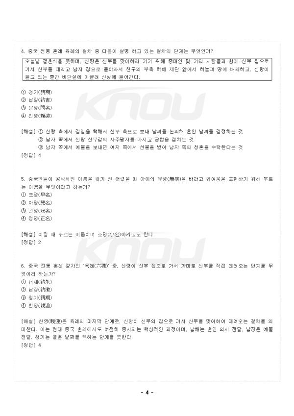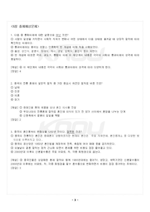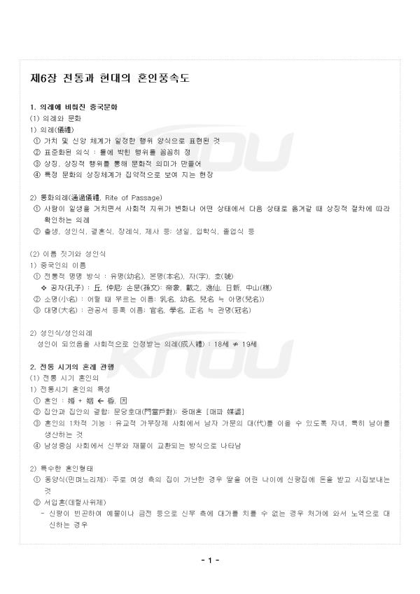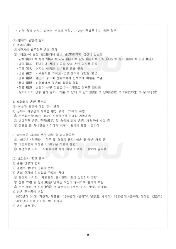 1. ÀÇ·Ê¿¡ ºñÃçÁø Áß±¹¹®È (1) ÀÇ·Ê¿Í ¹®È 1) ÀÇ·Ê(ëðÖÉ) ¨ç °¡Ä¡ ¹× ½Å¾Ó ü°è°¡ ÀÏÁ¤ÇÑ ÇàÀ§ ¾ç½ÄÀ¸·Î Ç¥ÇöµÈ °Í ¨è Ç¥ÁØÈµÈ ÀÇ½Ä : Ʋ¿¡ ¹ÚÈù ÇàÀ§¸¦ ²Ä²ÄÈ÷ Á¤ ¨é »ó¡, »ó¡Àû ÇàÀ§¸¦ ÅëÇØ ¹®ÈÀû Àǹ̰¡ ¸¸µé¾î ¨ê ƯÁ¤ ¹®ÈÀÇ »ó¡ü°è°¡ Áý¾àÀûÀ¸·Î º¸¿© Áö´Â ÇöÀå 2) ÅëÈÀÇ·Ê(÷×ΦëðÖÉ, Rite of Passage) ¨ç »ç¶÷ÀÌ ÀÏ»ýÀ» °ÅÄ¡¸é¼ »çȸÀû ÁöÀ§°¡ º¯È³ª ¾î¶² »óÅ¿¡¼ ´ÙÀ½ »óÅ·Π¿Å°Ü°¥ ¶§ »ó¡Àû ÀýÂ÷¿¡ µû¶ó È®ÀÎÇÏ´Â ÀÇ·Ê ¨è Ãâ»ý, ¼ºÀνÄ, °áÈ¥½Ä, Àå·Ê½Ä, Á¦»ç µî; »ýÀÏ, ÀÔÇнÄ, Á¹¾÷½Ä µî (2) À̸§ Áþ±â¿Í ¼ºÀÎ½Ä 1) Áß±¹ÀÎÀÇ À̸§ ¨ç ÀüÅëÀû ¸í¸í ¹æ½Ä : À¯¸í(êêÙ£), º»¸í(ÜâÙ£), ÀÚ(í®), È£(ûÜ) °øÀÚ(Íîí) : Îø, ñêÒù; ¼Õ¹®(áÝÙþ): ð¨ßÚ, î°ñý, ìïà¹, ìíãæ, ñéߣ(õ£) ¨è ¼Ò¸í(á³Ù£) : ¾î¸± ¶§ ºÎ¸£´Â À̸§; êáÙ£, êêÙ£, ä®Ù£ ¡Ö ¾Æ¸í(ä®Ù£)) ¨é ´ë¸í(ÓÞÙ£) : °ü°ø¼ µî·Ï À̸§; ί٣, ùÊÙ£, ïáÙ£ ¡Ö °ü¸í(ή٣) 2) ¼ºÀνÄ/¼ºÀÎÀÇ·Ê ¼ºÀÎÀÌ µÇ¾úÀ½À» »çȸÀûÀ¸·Î ÀÎÁ¤¹Þ´Â ÀÇ·Ê(à÷ìÑÖÉ) : 18¼¼ ¡Á 19¼¼ 2. ÀüÅë ½Ã±âÀÇ È¥·Ê °üÇà (1) ÀüÅë ½Ã±â È¥ÀÎÀÇ 1) ÀüÅë½Ã±â È¥ÀÎÀÇ Æ¯¼º ¨ç È¥ÀÎ : ûæ + ìØ ûç, ì× ¨è Áý¾È°ú Áý¾ÈÀÇ °áÇÕ; ¹®´çÈ£´ë(Ú¦Ó×ûÂÓß); Á߸ÅÈ¥ [¸ÅÆÄ ØÚ÷è] ¨é È¥ÀÎÀÇ 1Â÷Àû ±â´É : À¯±³Àû °¡ºÎÀåÁ¦ »çȸ¿¡¼ ³²ÀÚ °¡¹®ÀÇ ´ë(ÓÛ)¸¦ ÀÌÀ» ¼ö ÀÖµµ·Ï ÀÚ³à, ƯÈ÷ ³²¾Æ¸¦ »ý»êÇÏ´Â °Í ¨ê ³²¼ºÁ᫐ »çȸ¿¡¼ ½ÅºÎ¿Í Àç¹°ÀÌ ±³È¯µÇ´Â ¹æ½ÄÀ¸·Î ³ªÅ¸³² 2) Ư¼öÇÑ È¥ÀÎÇüÅ ¨ç µ¿¾ç½Ä(¹Î¸ç´À¸®Á¦): ÁÖ·Î ¿©¼º ÃøÀÇ ÁýÀÌ °¡³ÇÑ °æ¿ì µþÀ» ¾î¸° ³ªÀÌ¿¡ ½Å¶ûÁý¿¡ µ·À» ¹Þ°í ½ÃÁýº¸³»´Â °Í ¨è ¼ÀÔÈ¥(µ¥¸±»çÀ§Á¦) - ½Å¶ûÀÌ ºó°ïÇÏ¿© ¿¹¹°À̳ª ±ÝÀü µîÀ¸·Î ½ÅºÎ Ãø¿¡ ´ë°¡¸¦ Ä¡¸¦ ¼ö ¾ø´Â °æ¿ì ó°¡¿¡ ¿Í¼ ³ë¿ªÀ¸·Î ´ë½ÅÇÏ´Â °æ¿ì - ½ÅºÎ Ãø¿¡ ³²ÀÚ°¡ ¾ø¾î¼ ºÎ¸ðÀÇ ºÎ¾çÀ̳ª °¡»ê °ü¸®¸¦ Çϱâ À§ÇÑ °æ¿ì (2) È¥·ÊÀÇ ÀϹÝÀû ÀýÂ÷ 1) À°·Ê(ë»ÖÉ) ¨ç 6´Ü°èÀÇ Ç¥ÁØÈµÈ È¥·Ê ÀýÂ÷ ¨è <çßÑÀ>¿¡ µîÀå; ÇÑ(ùÓ)´ë¿¡ ¿Ïºñ; ¼Û(áä)´ëºÎÅÍ Á¡ÁøÀû °£¼ÒÈ - ³³Ã¤(Ò¡óú) ¢¡ ¹®¸í(ÙýÙ£) ¢¡ ³³±æ(Ò¡ÑÎ) ¢¡ ³³Â¡(Ò¡ÑÎ) ¢¡ ³Â¡(Ò¡ó£) ¢¡ û±â(ôëÑ¢) ¢¡ Ä£¿µ(öÑçÊ) *³³Ã¤ Ò¡óú : Á߸ÅÀÎÀ» ÅëÇØ ¿¹¹°À» º¸³» È¥ÀÎ Àǻ縦 Àü´Þ *¹®¸í ÙýÙ£ : ¿©ÀÚÀÇ À̸§°ú »ý³â¿ùÀÏ µîÀ» ¹°À½ *³³±æ Ò¡ÑÎ : »çÁÖÆÈÀÚ¸¦ °¡Áö°í (Á¶»ó)½Å¿¡°Ô ±ÃÇÕÀ» ¹°À½ *³³Â¡ Ò¡ó£ : È¥ÀÎÀÇ Â¡Ç¥·Î ½Å¶ûÃø¿¡¼ ½ÅºÎÃø¿¡ ¿¹¹°À» º¸³¿ *û±â ôëÑ¢ : ½Å¶ûÃø¿¡¼ °áÈ¥ÀÇ ±æÀÏÀ» ÅÃÇÔ *Ä£¿µ öÑçÊ : ½Å¶ûÀÌ ½ÅºÎ ÁýÀ¸·Î °¡¼ °¡¸¶·Î ½ÅºÎ¸¦ µ¥·Á¿È - ¿ì¸®³ª¶óÀÇ ÀÜÅë È¥·Ê ÀýÂ÷- ÀÇÈ¥ ¢¡ ³³Ã¤ ¢¡ ³³±â(Ò¡Ñ¢) ¢¡ ³³Æó(Ò¡øÇ) ¢¡ ´ë·Ê(ÓÞÖÉ) ¢¡ ¿ì±Í(éÍÏý) 3. ¿À´Ã³¯ÀÇ È¥ÀΠdz¼Óµµ (1) ¿©¼º°ú È¥Àο¡ ´ëÇÑ ÀÎ½Ä º¯È 1) ±Ù´ëÀû ¿©¼º°ü°ú »õ·Î¿î È¥ÀÎ ¹æ½Ä : 20¼¼±â ÃÊ¹Ý ¨ç ½Å¹®È¿îµ¿(1915~1921) : ¹ü±¹¹ÎÀû ±Ù´ëÈ °è¸ù¿îµ¿ ¨è ¿©¼ºÀ뱂 ¿îµ¿, ÀüÁ·(ï«ðë) ¹× ÃàøÁ¦ ÆóÁö ¿îµ¿, ÀÚÀ¯¿¬¾Ö »ç»ó µî ¨é »ó·ùÃþ ¹× Áö½ÄÀÎÃþ »çÀÌ¿¡¼ ¼±¸½Ä È¥·ÊÀÇ À¯Çà : »óÇÏÀÌ - Áß·« - |