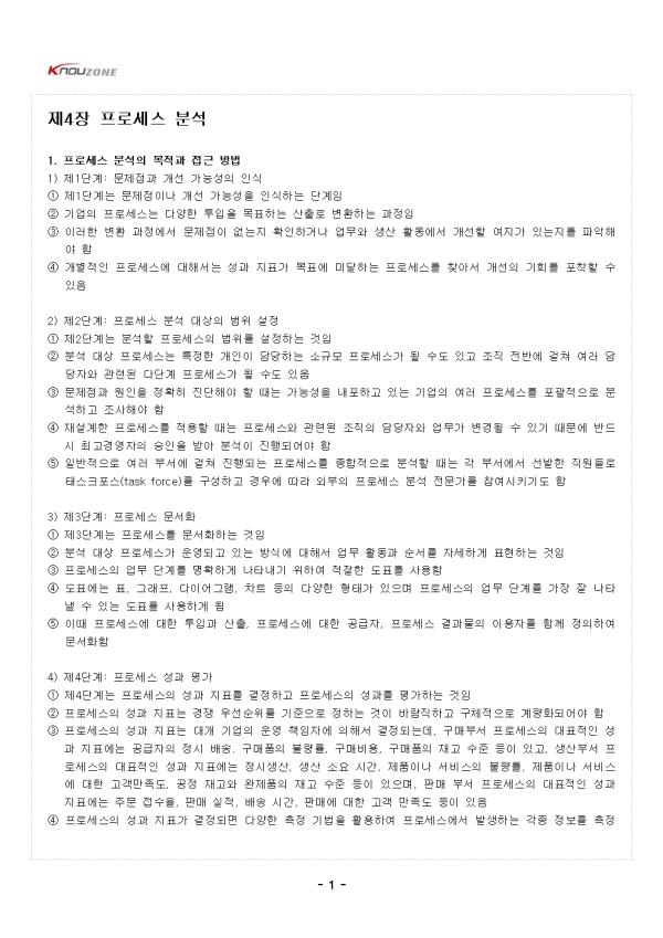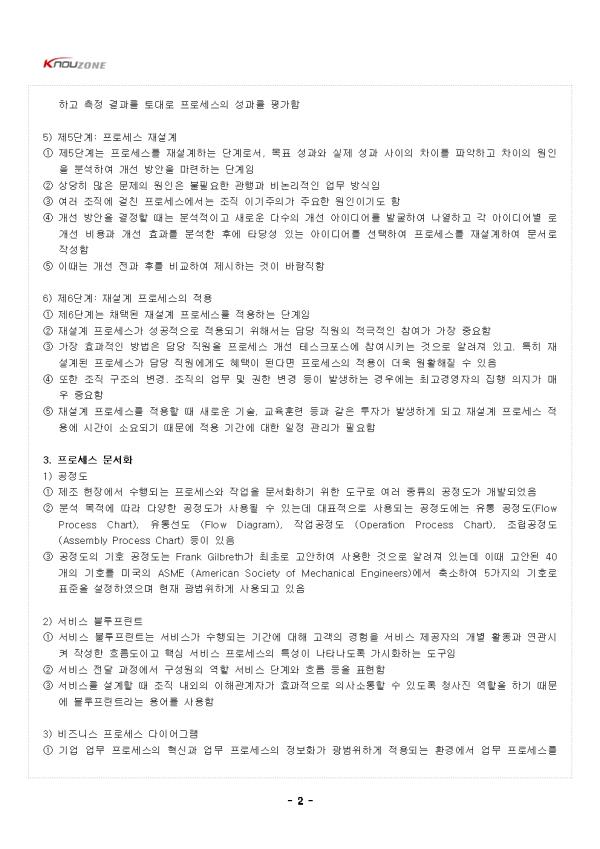1. ÇÁ·Î¼¼½º ºÐ¼®ÀÇ ¸ñÀû°ú Á¢±Ù ¹æ¹ý 1) Á¦1´Ü°è: ¹®Á¦Á¡°ú °³¼± °¡´É¼ºÀÇ ÀÎ½Ä ¨ç Á¦1´Ü°è´Â ¹®Á¦Á¡À̳ª °³¼± °¡´É¼ºÀ» ÀνÄÇÏ´Â ´Ü°èÀÓ ¨è ±â¾÷ÀÇ ÇÁ·Î¼¼½º´Â ´Ù¾çÇÑ ÅõÀÔÀ» ¸ñÇ¥ÇÏ´Â »êÃâ·Î º¯È¯ÇÏ´Â °úÁ¤ÀÓ ¨é ÀÌ·¯ÇÑ º¯È¯ °úÁ¤¿¡¼ ¹®Á¦Á¡ÀÌ ¾ø´ÂÁö È®ÀÎÇϰųª ¾÷¹«¿Í »ý»ê Ȱµ¿¿¡¼ °³¼±ÇÒ ¿©Áö°¡ ÀÖ´ÂÁö¸¦ ÆÄ¾ÇÇØ¾ß ÇÔ ¨ê °³º°ÀûÀÎ ÇÁ·Î¼¼½º¿¡ ´ëÇØ¼´Â ¼º°ú ÁöÇ¥°¡ ¸ñÇ¥¿¡ ¹Ì´ÞÇÏ´Â ÇÁ·Î¼¼½º¸¦ ã¾Æ¼ °³¼±ÀÇ ±âȸ¸¦ Æ÷ÂøÇÒ ¼ö ÀÖÀ½ 2) Á¦2´Ü°è: ÇÁ·Î¼¼½º ºÐ¼® ´ë»óÀÇ ¹üÀ§ ¼³Á¤ ¨ç Á¦2´Ü°è´Â ºÐ¼®ÇÒ ÇÁ·Î¼¼½ºÀÇ ¹üÀ§¸¦ ¼³Á¤ÇÏ´Â °ÍÀÓ ¨è ºÐ¼® ´ë»ó ÇÁ·Î¼¼½º´Â ƯÁ¤ÇÑ °³ÀÎÀÌ ´ã´çÇÏ´Â ¼Ò±Ô¸ð ÇÁ·Î¼¼½º°¡ µÉ ¼öµµ ÀÖ°í Á¶Á÷ Àü¹Ý¿¡ °ÉÃÄ ¿©·¯ ´ã´çÀÚ¿Í °ü·ÃµÈ ´Ù´Ü°è ÇÁ·Î¼¼½º°¡ µÉ ¼öµµ ÀÖÀ½ ¨é ¹®Á¦Á¡°ú ¿øÀÎÀ» Á¤È®È÷ Áø´ÜÇØ¾ß ÇÒ ¶§´Â °¡´É¼ºÀ» ³»Æ÷Çϰí ÀÖ´Â ±â¾÷ÀÇ ¿©·¯ ÇÁ·Î¼¼½º¸¦ Æ÷°ýÀûÀ¸·Î ºÐ¼®Çϰí Á¶»çÇØ¾ß ÇÔ ¨ê Àç¼³°èÇÑ ÇÁ·Î¼¼½º¸¦ Àû¿ëÇÒ ¶§´Â ÇÁ·Î¼¼½º¿Í °ü·ÃµÈ Á¶Á÷ÀÇ ´ã´çÀÚ¿Í ¾÷¹«°¡ º¯°æµÉ ¼ö Àֱ⠶§¹®¿¡ ¹Ýµå½Ã ÃÖ°í°æ¿µÀÚÀÇ ½ÂÀÎÀ» ¹Þ¾Æ ºÐ¼®ÀÌ ÁøÇàµÇ¾î¾ß ÇÔ ¨ë ÀϹÝÀûÀ¸·Î ¿©·¯ ºÎ¼¿¡ °ÉÃÄ ÁøÇàµÇ´Â ÇÁ·Î¼¼½º¸¦ Á¾ÇÕÀûÀ¸·Î ºÐ¼®ÇÒ ¶§´Â °¢ ºÎ¼¿¡¼ ¼±¹ßÇÑ Á÷¿øµé·Î ŽºÅ©Æ÷½º(task force)¸¦ ±¸¼ºÇÏ°í °æ¿ì¿¡ µû¶ó ¿ÜºÎÀÇ ÇÁ·Î¼¼½º ºÐ¼® Àü¹®°¡¸¦ Âü¿©½Ã۱⵵ ÇÔ 3) Á¦3´Ü°è: ÇÁ·Î¼¼½º ¹®¼È ¨ç Á¦3´Ü°è´Â ÇÁ·Î¼¼½º¸¦ ¹®¼ÈÇÏ´Â °ÍÀÓ ¨è ºÐ¼® ´ë»ó ÇÁ·Î¼¼½º°¡ ¿î¿µµÇ°í ÀÖ´Â ¹æ½Ä¿¡ ´ëÇØ¼ ¾÷¹« Ȱµ¿°ú ¼ø¼¸¦ ÀÚ¼¼ÇÏ°Ô Ç¥ÇöÇÏ´Â °ÍÀÓ ¨é ÇÁ·Î¼¼½ºÀÇ ¾÷¹« ´Ü°è¸¦ ¸íÈ®ÇÏ°Ô ³ªÅ¸³»±â À§ÇÏ¿© ÀûÀýÇÑ µµÇ¥¸¦ »ç¿ëÇÔ ¨ê µµÇ¥¿¡´Â Ç¥, ±×·¡ÇÁ, ´ÙÀ̾î±×·¥, Â÷Æ® µîÀÇ ´Ù¾çÇÑ ÇüŰ¡ ÀÖÀ¸¸ç ÇÁ·Î¼¼½ºÀÇ ¾÷¹« ´Ü°è¸¦ °¡Àå Àß ³ªÅ¸³¾ ¼ö ÀÖ´Â µµÇ¥¸¦ »ç¿ëÇÏ°Ô µÊ ¨ë À̶§ ÇÁ·Î¼¼½º¿¡ ´ëÇÑ ÅõÀÔ°ú »êÃâ, ÇÁ·Î¼¼½º¿¡ ´ëÇÑ °ø±ÞÀÚ, ÇÁ·Î¼¼½º °á°ú¹°ÀÇ ÀÌ¿ëÀÚ¸¦ ÇÔ²² Á¤ÀÇÇÏ¿© ¹®¼ÈÇÔ 4) Á¦4´Ü°è: ÇÁ·Î¼¼½º ¼º°ú Æò°¡ ¨ç Á¦4´Ü°è´Â ÇÁ·Î¼¼½ºÀÇ ¼º°ú ÁöÇ¥¸¦ °áÁ¤Çϰí ÇÁ·Î¼¼½ºÀÇ ¼º°ú¸¦ Æò°¡ÇÏ´Â °ÍÀÓ ¨è ÇÁ·Î¼¼½ºÀÇ ¼º°ú ÁöÇ¥´Â °æÀï ¿ì¼±¼øÀ§¸¦ ±âÁØÀ¸·Î Á¤ÇÏ´Â °ÍÀÌ ¹Ù¶÷Á÷ÇÏ°í ±¸Ã¼ÀûÀ¸·Î °è·®ÈµÇ¾î¾ß ÇÔ ¨é ÇÁ·Î¼¼½ºÀÇ ¼º°ú ÁöÇ¥´Â ´ë°³ ±â¾÷ÀÇ ¿î¿µ Ã¥ÀÓÀÚ¿¡ ÀÇÇØ¼ °áÁ¤µÇ´Âµ¥, ±¸¸ÅºÎ¼ ÇÁ·Î¼¼½ºÀÇ ´ëÇ¥ÀûÀÎ ¼º°ú ÁöÇ¥¿¡´Â °ø±ÞÀÚÀÇ Á¤½Ã ¹è¼Û. ±¸¸ÅǰÀÇ ºÒ·®·ü, ±¸¸Åºñ¿ë, ±¸¸ÅǰÀÇ Àç°í ¼öÁØ µîÀÌ ÀÖ°í, »ý»êºÎ¼ ÇÁ·Î¼¼½ºÀÇ ´ëÇ¥ÀûÀÎ ¼º°ú ÁöÇ¥¿¡´Â Á¤½Ã»ý»ê, »ý»ê ¼Ò¿ä ½Ã°£, Á¦Ç°À̳ª ¼ºñ½ºÀÇ ºÒ·®·ü, Á¦Ç°À̳ª ¼ºñ½º¿¡ ´ëÇÑ °í°´¸¸Á·µµ, °øÁ¤ Àç°í¿Í ¿ÏÁ¦Ç°ÀÇ Àç°í ¼öÁØ µîÀÌ ÀÖÀ¸¸ç, ÆÇ¸Å ºÎ¼ ÇÁ·Î¼¼½ºÀÇ ´ëÇ¥ÀûÀÎ ¼º°ú ÁöÇ¥¿¡´Â ÁÖ¹® Á¢¼öÀ², ÆÇ¸Å ½ÇÀû, ¹è¼Û ½Ã°£, ÆÇ¸Å¿¡ ´ëÇÑ °í°´ ¸¸Á·µµ µîÀÌ ÀÖÀ½ ¨ê ÇÁ·Î¼¼½ºÀÇ ¼º°ú ÁöÇ¥°¡ °áÁ¤µÇ¸é ´Ù¾çÇÑ ÃøÁ¤ ±â¹ýÀ» Ȱ¿ëÇÏ¿© ÇÁ·Î¼¼½º¿¡¼ ¹ß»ýÇÏ´Â °¢Á¾ Á¤º¸¸¦ ÃøÁ¤Çϰí ÃøÁ¤ °á°ú¸¦ Åä´ë·Î ÇÁ·Î¼¼½ºÀÇ ¼º°ú¸¦ Æò°¡ÇÔ 5) Á¦5´Ü°è: ÇÁ·Î¼¼½º Àç¼³°è ¨ç Á¦5´Ü°è´Â ÇÁ·Î¼¼½º¸¦ Àç¼³°èÇÏ´Â ´Ü°è·Î¼, ¸ñÇ¥ ¼º°ú¿Í ½ÇÁ¦ ¼º°ú »çÀÌÀÇ Â÷À̸¦ ÆÄ¾ÇÇϰí Â÷ÀÌÀÇ ¿øÀÎÀ» ºÐ¼®ÇÏ¿© °³¼± ¹æ¾ÈÀ» ¸¶·ÃÇÏ´Â ´Ü°èÀÓ ¨è »ó´çÈ÷ ¸¹Àº ¹®Á¦ÀÇ ¿øÀÎÀº ºÒÇÊ¿äÇÑ °üÇà°ú ºñ³í¸®ÀûÀÎ ¾÷¹« ¹æ½ÄÀÓ ¨é ¿©·¯ Á¶Á÷¿¡ °ÉÄ£ ÇÁ·Î¼¼½º¿¡¼´Â Á¶Á÷ À̱âÁÖÀǰ¡ ÁÖ¿äÇÑ ¿øÀÎÀ̱⵵ ÇÔ ¨ê °³¼± ¹æ¾ÈÀ» °áÁ¤ÇÒ ¶§´Â ºÐ¼®ÀûÀÌ°í »õ·Î¿î ´Ù¼öÀÇ °³¼± ¾ÆÀ̵ð¾î¸¦ ¹ß±¼ÇÏ¿© ³ª¿ÇÏ°í °¢ ¾ÆÀ̵ð¾îº° ·Î °³¼± ºñ¿ë°ú °³¼± È¿°ú¸¦ ºÐ¼®ÇÑ ÈÄ¿¡ Ÿ´ç¼º ÀÖ´Â ¾ÆÀ̵ð¾î¸¦ ¼±ÅÃÇÏ¿© ÇÁ·Î¼¼½º¸¦ Àç¼³°èÇÏ¿© ¹®¼·Î ÀÛ¼ºÇÔ ¨ë À̶§´Â °³¼± Àü°ú Èĸ¦ ºñ±³ÇÏ¿© Á¦½ÃÇÏ´Â °ÍÀÌ ¹Ù¶÷Á÷ÇÔ - Áß·« - |